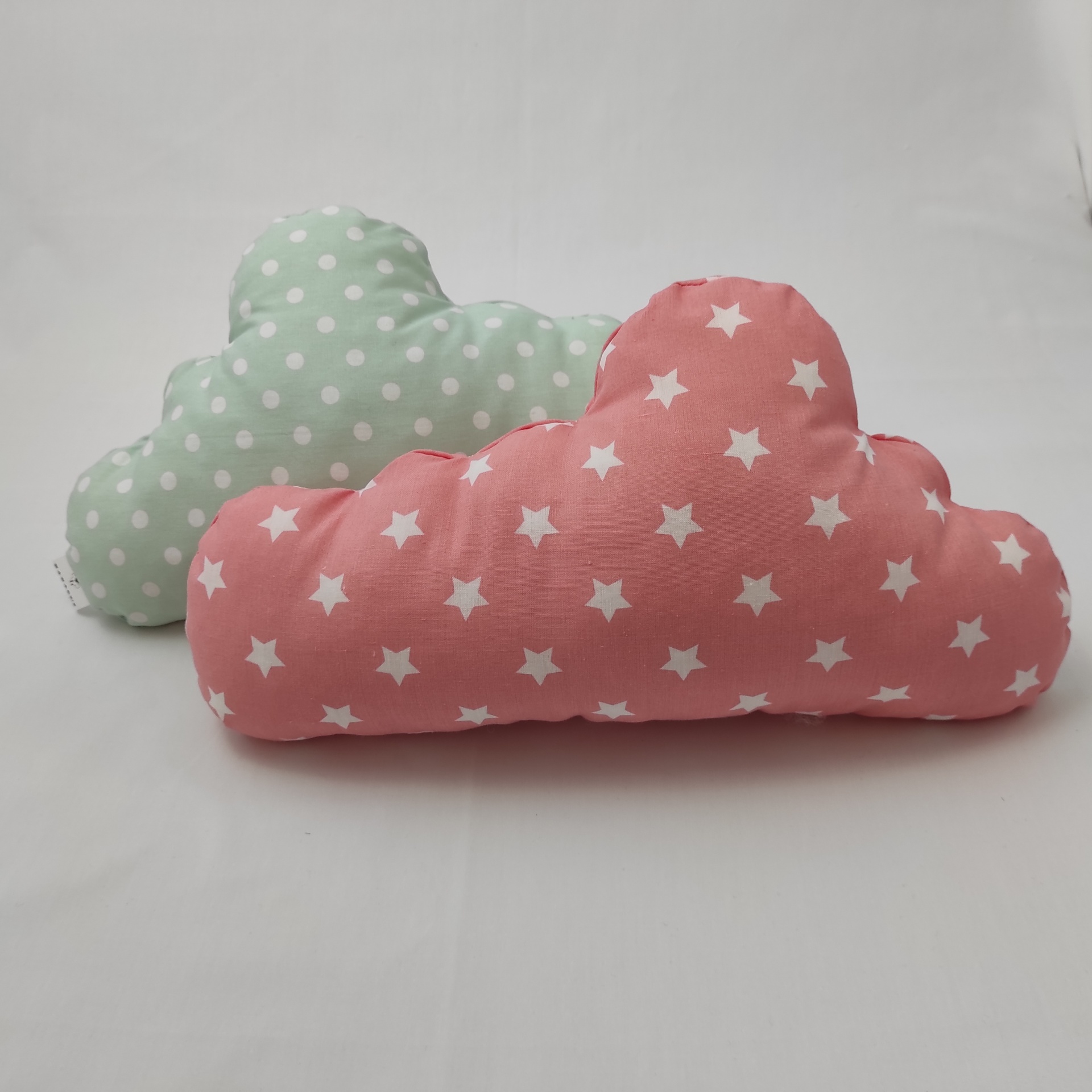 • Duas almofadas em formato de nuvem, cor-de-rosa e verde claro, com padrões de estrelas e bolinhas brancas.