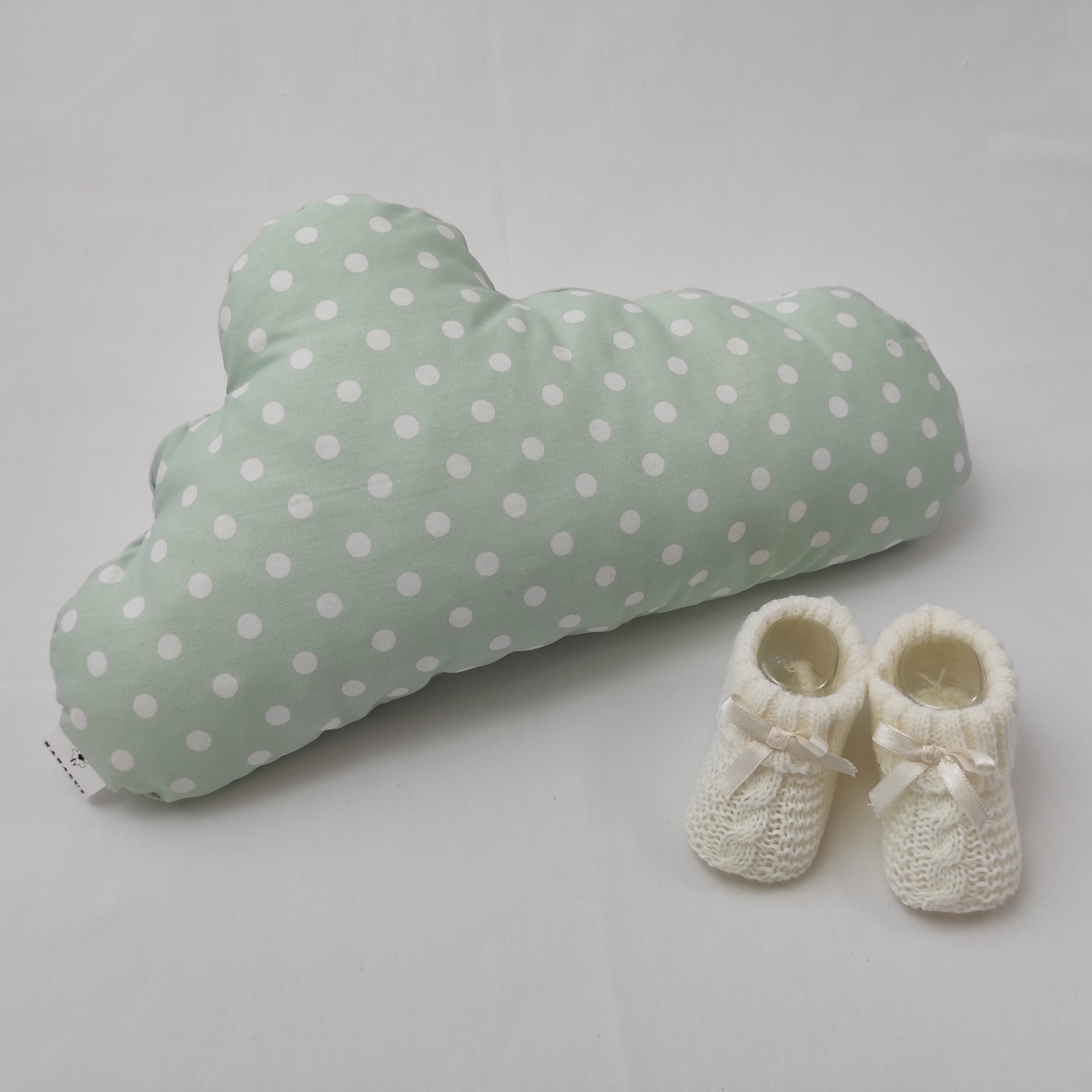 • Almofada verde com bolinhas brancas e sapatinhos de bebé brancos em malha