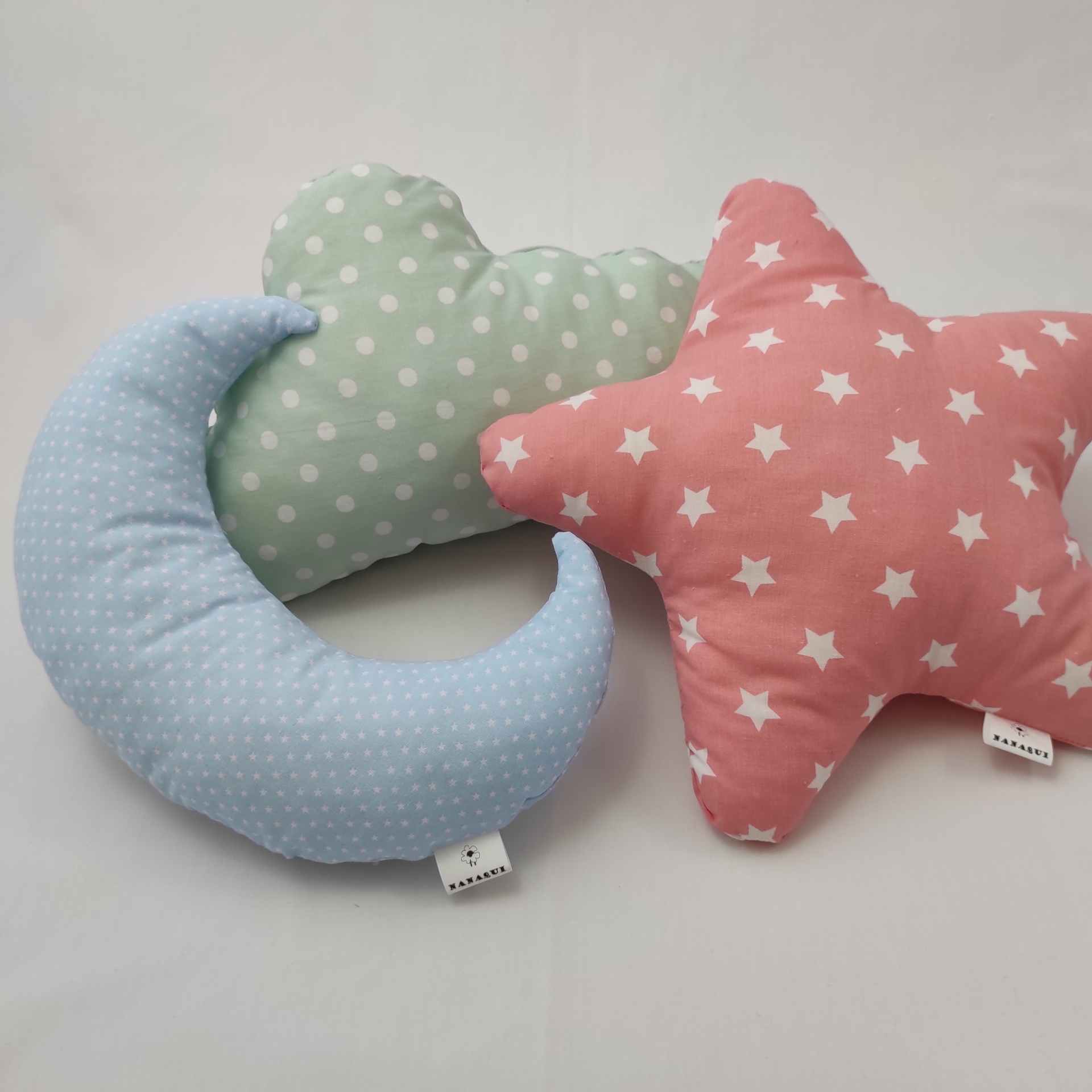 • Três almofadas decorativas em forma de lua, nuvem e estrela com padrões de pontos e estrelas