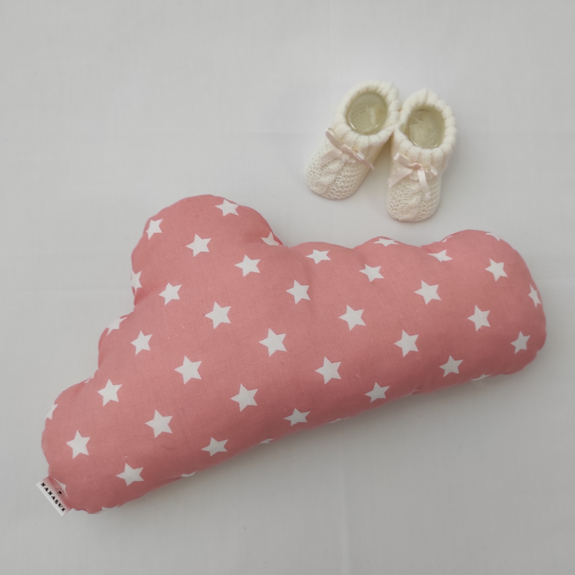 • Travesseiro nuvem rosa com estrelas brancas e sapatinhos de bebé brancos