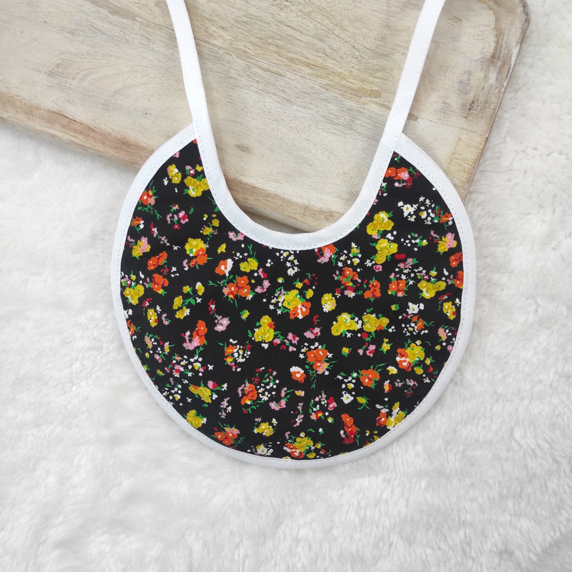• Babete redonda preta com flores coloridas e bordas brancas