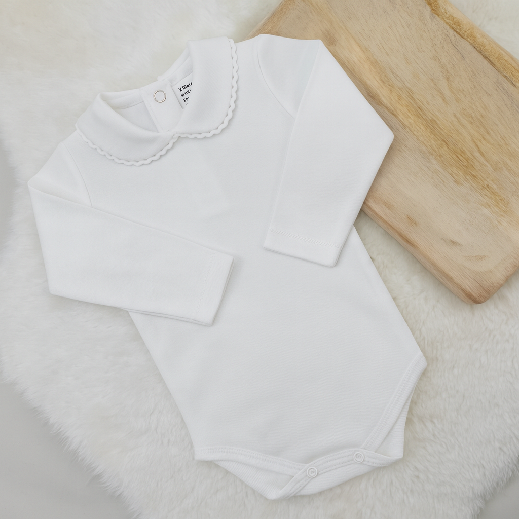 • Body de bebé branco de manga comprida com gola decorativa