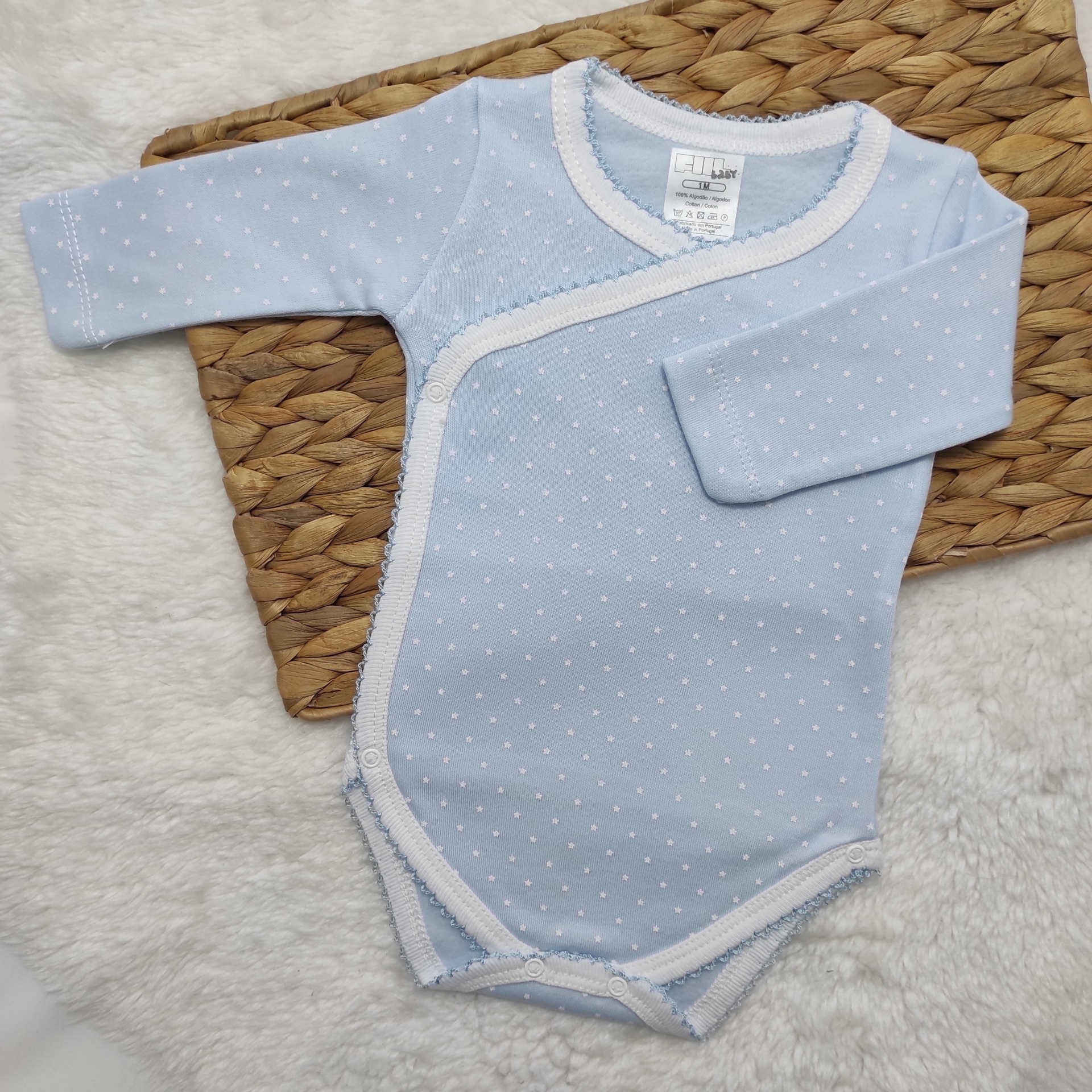• Body azul claro para bebé com padrão de pequenos pontos brancos e mangas compridas