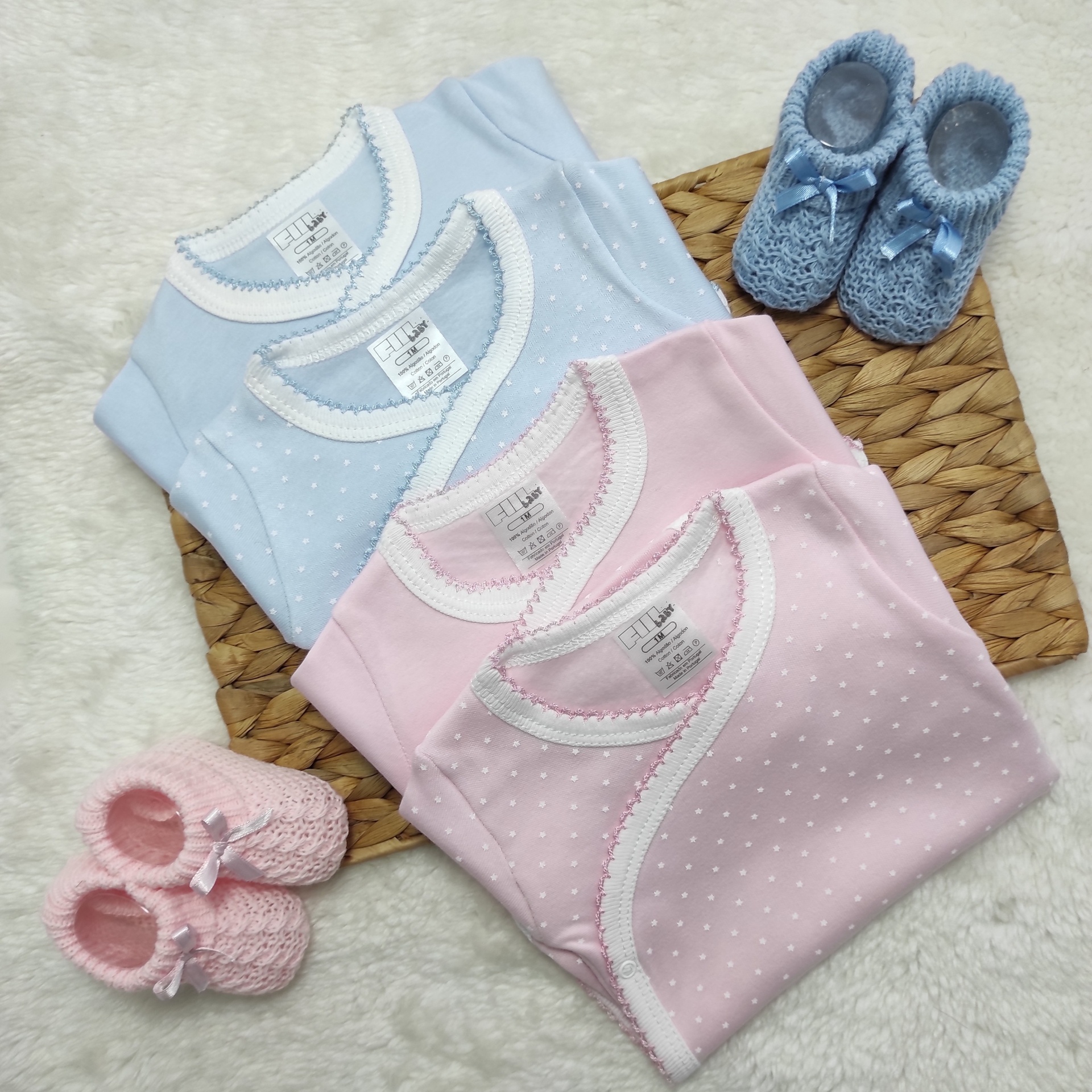 • Bodys de bebé azuis e rosas com botinhas de lã
