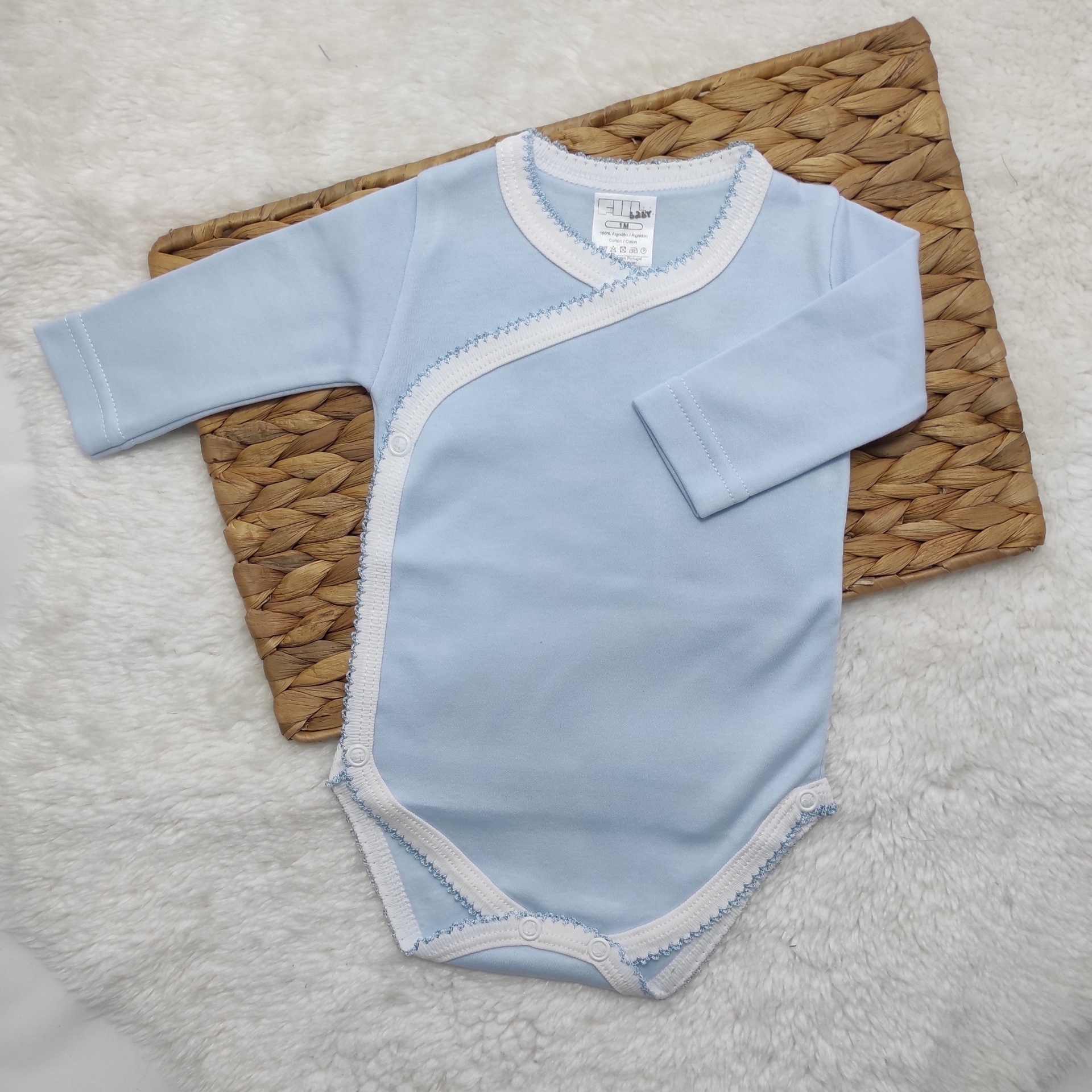 • Body azul claro de manga comprida para bebé com bordas brancas sobre tapete branco felpudo