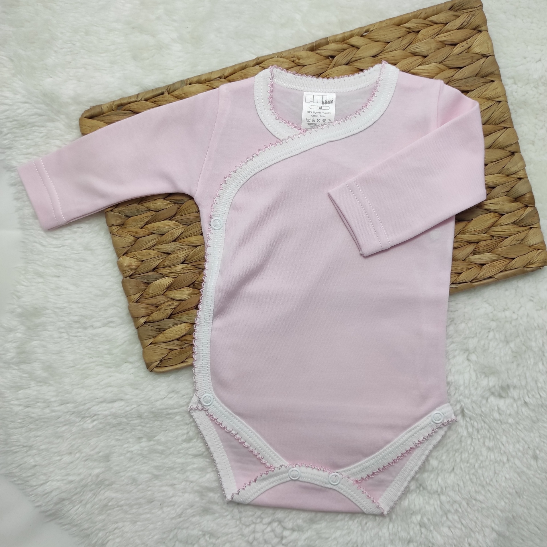 • Body de bebé rosa com renda branca e fechos de pressão