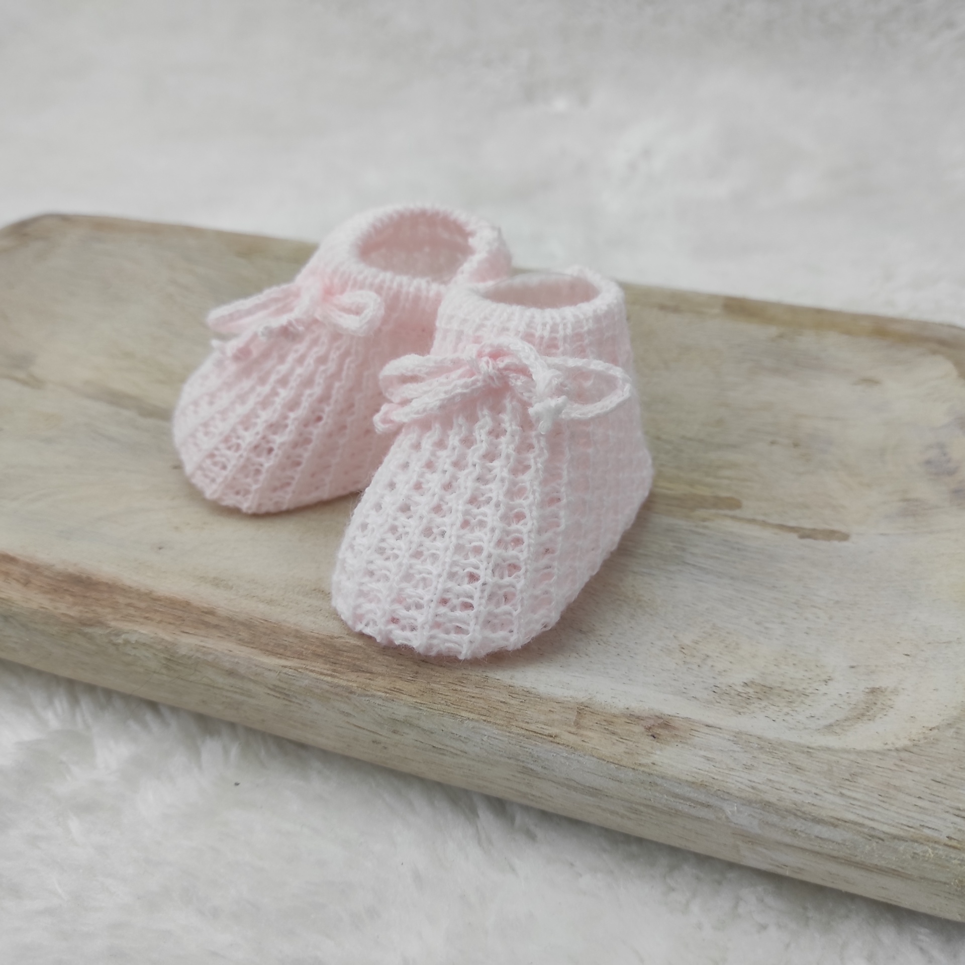 • Sapatinhos de bebé rosa claro em malha com laços na bandeja de madeira