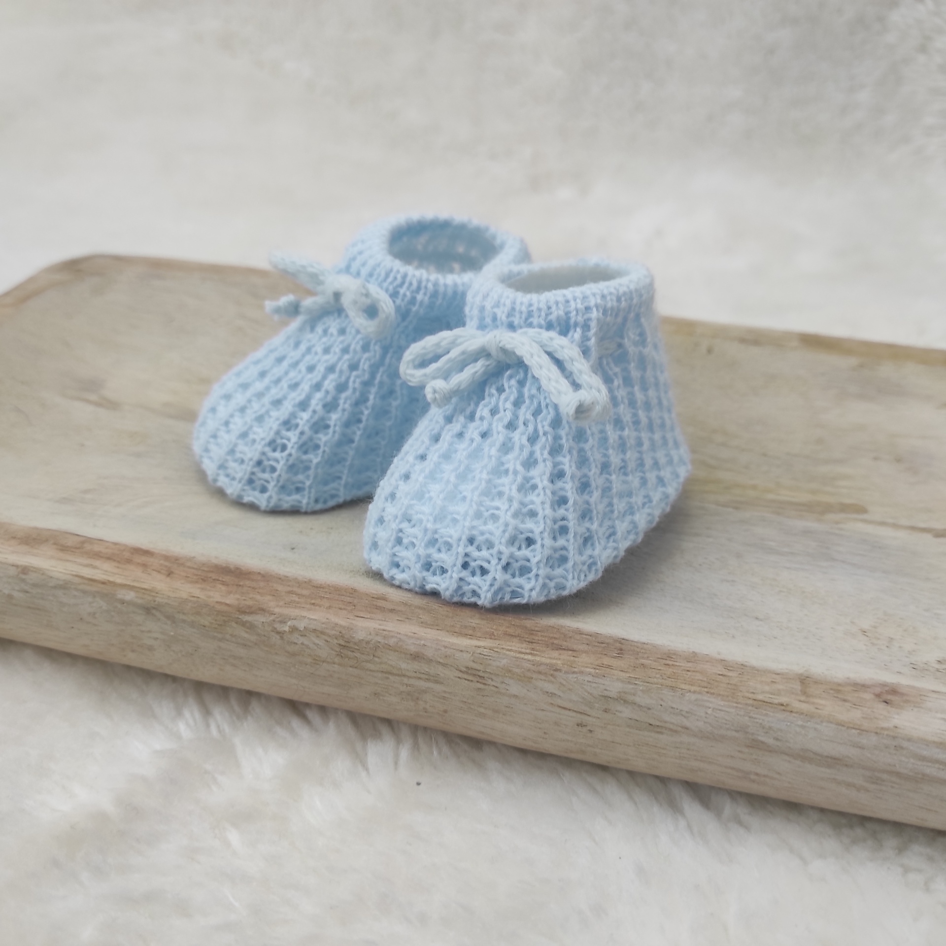 • Sapatinhos de bebé de malha azul clara com laço, sobre base de madeira clara