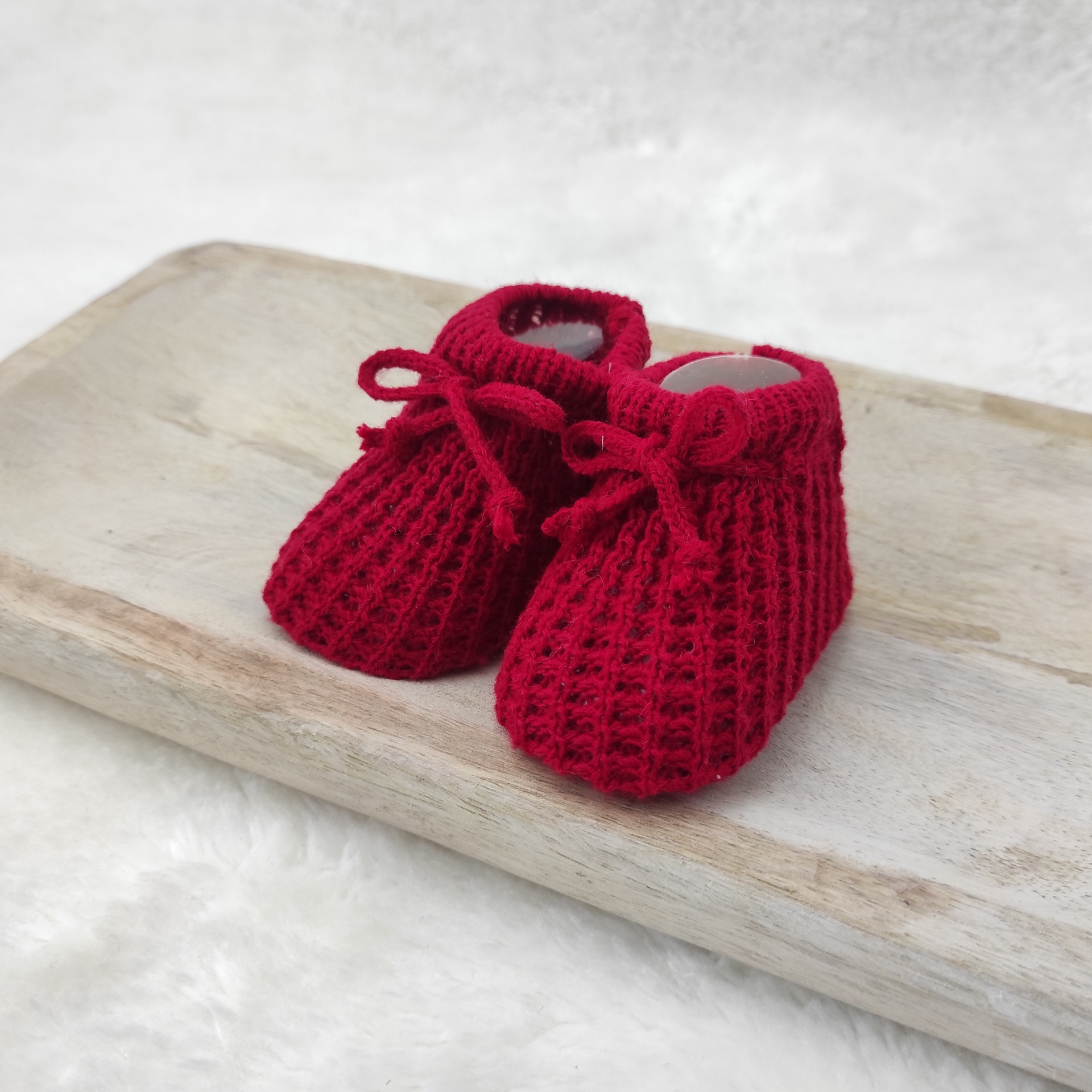 • Sapatinhos de bebé vermelhos em malha texturizada com laços, sobre tábua de madeira clara