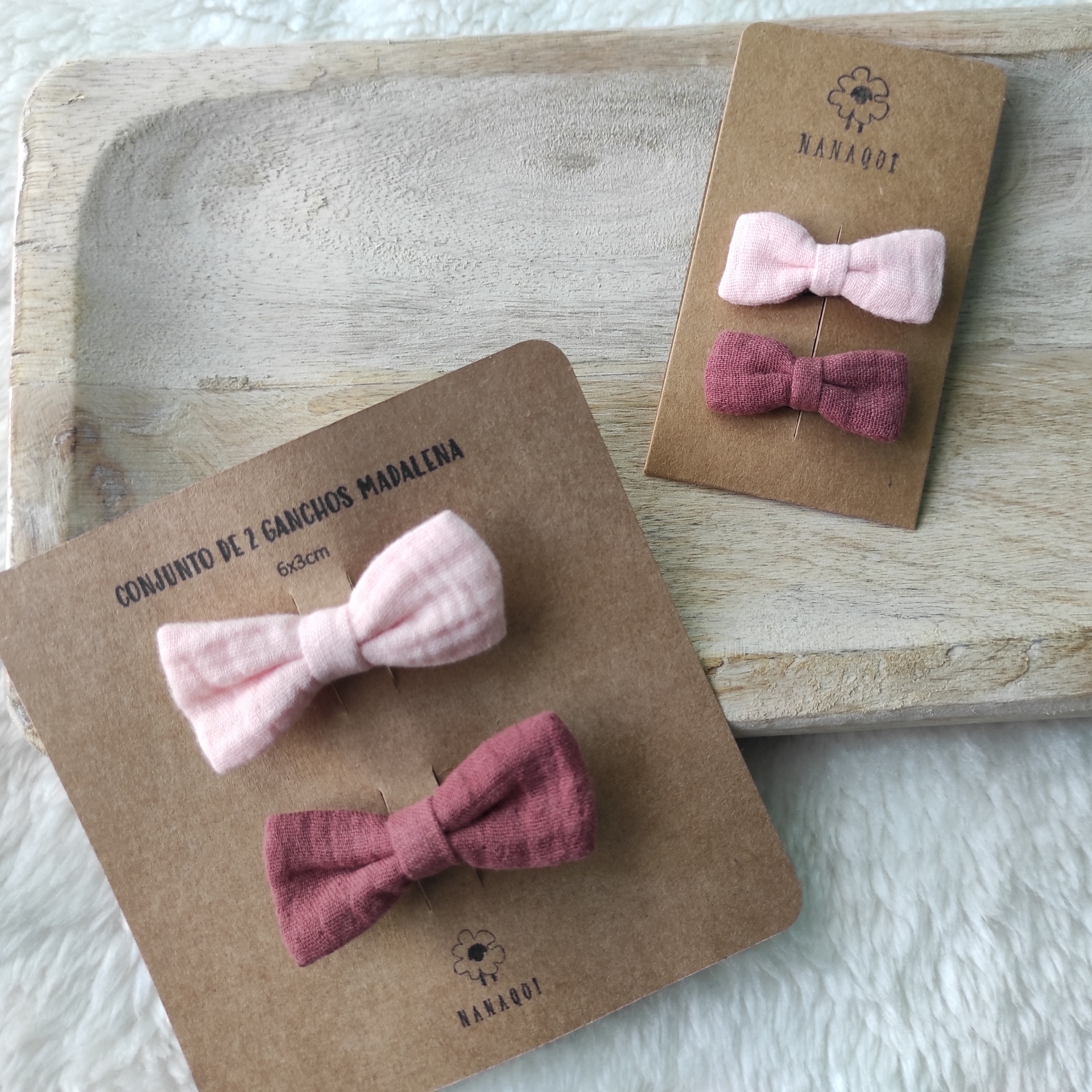 • Conjunto de dois ganchos de cabelo rosa e bordeaux em cartão castanho sobre bandeja de madeira