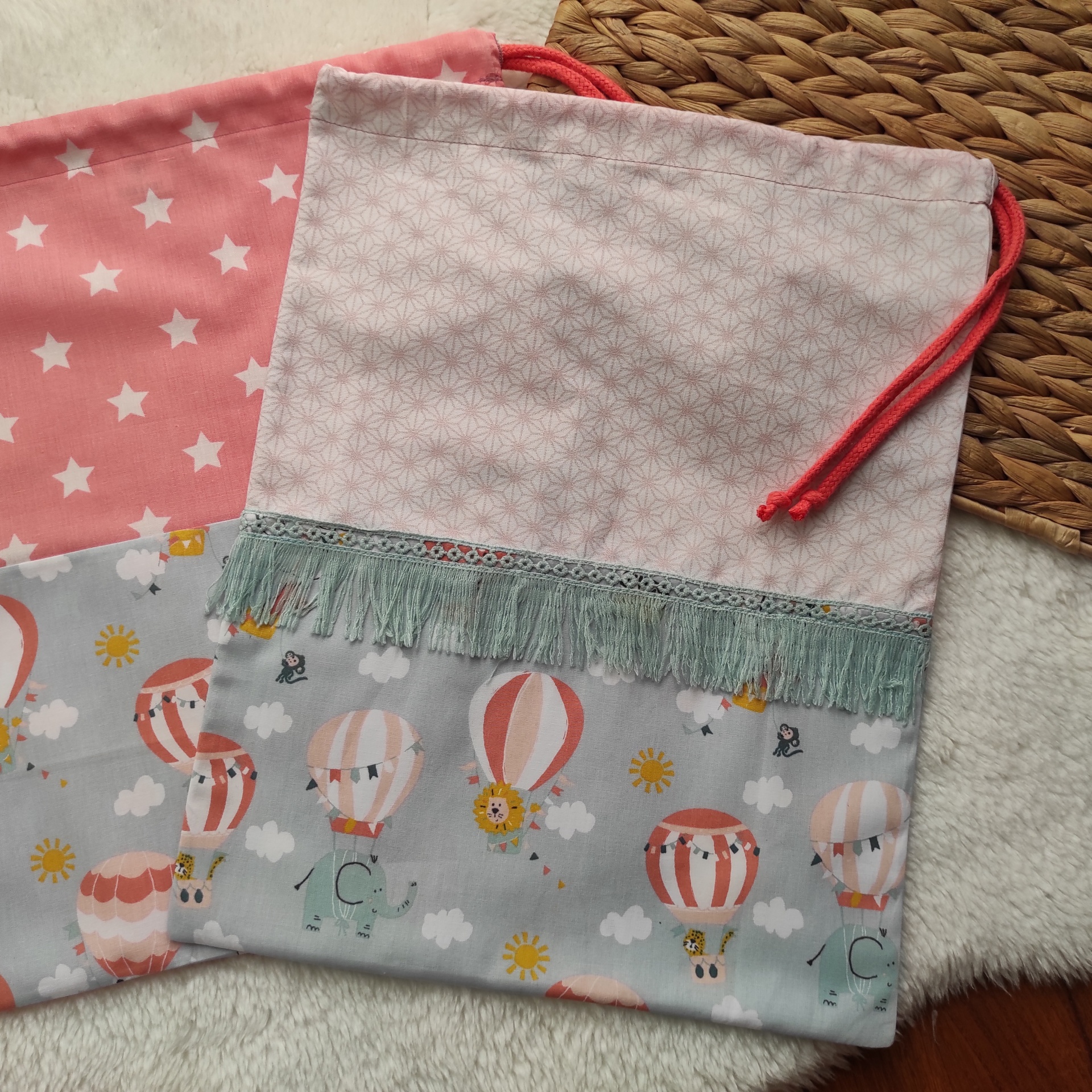 • Duas bolsas de tecido coloridas com cordão e padrões variados sobre superfícies de tecido e material natural trançado.