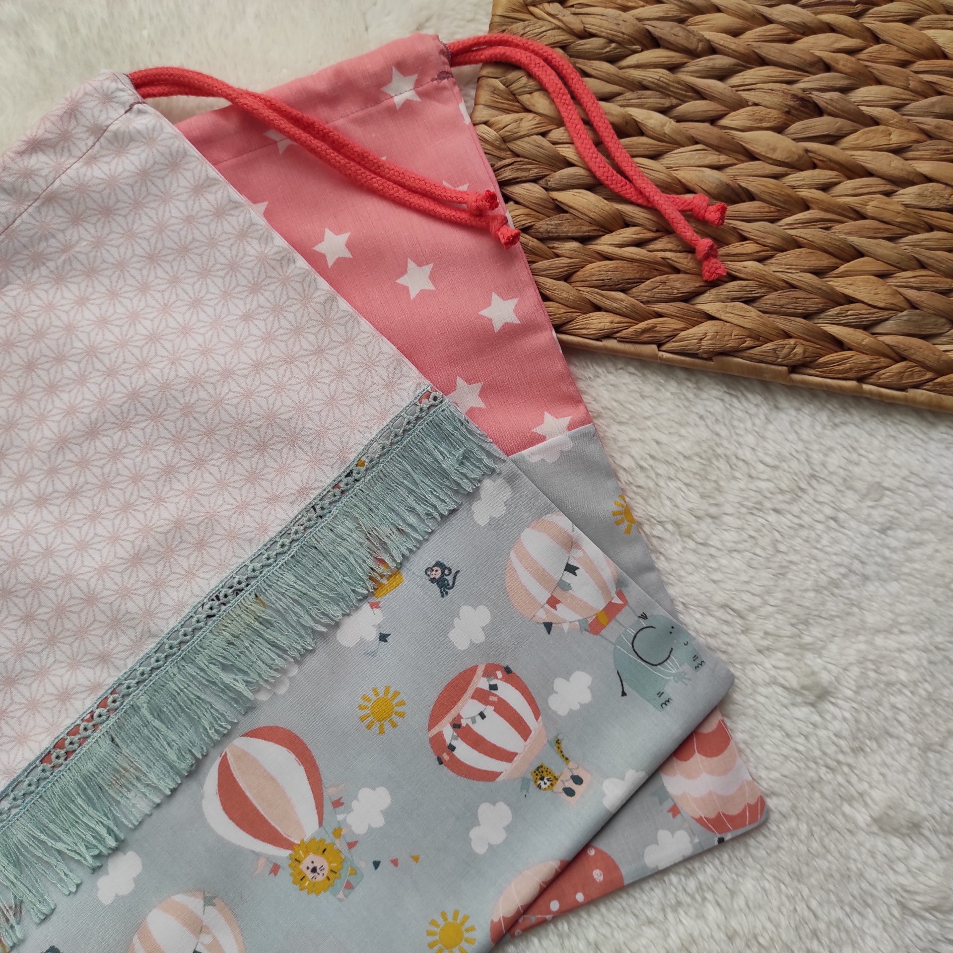 • Sacos coloridos com padrão de balões e toalha branca bordada com balão de ar quente.