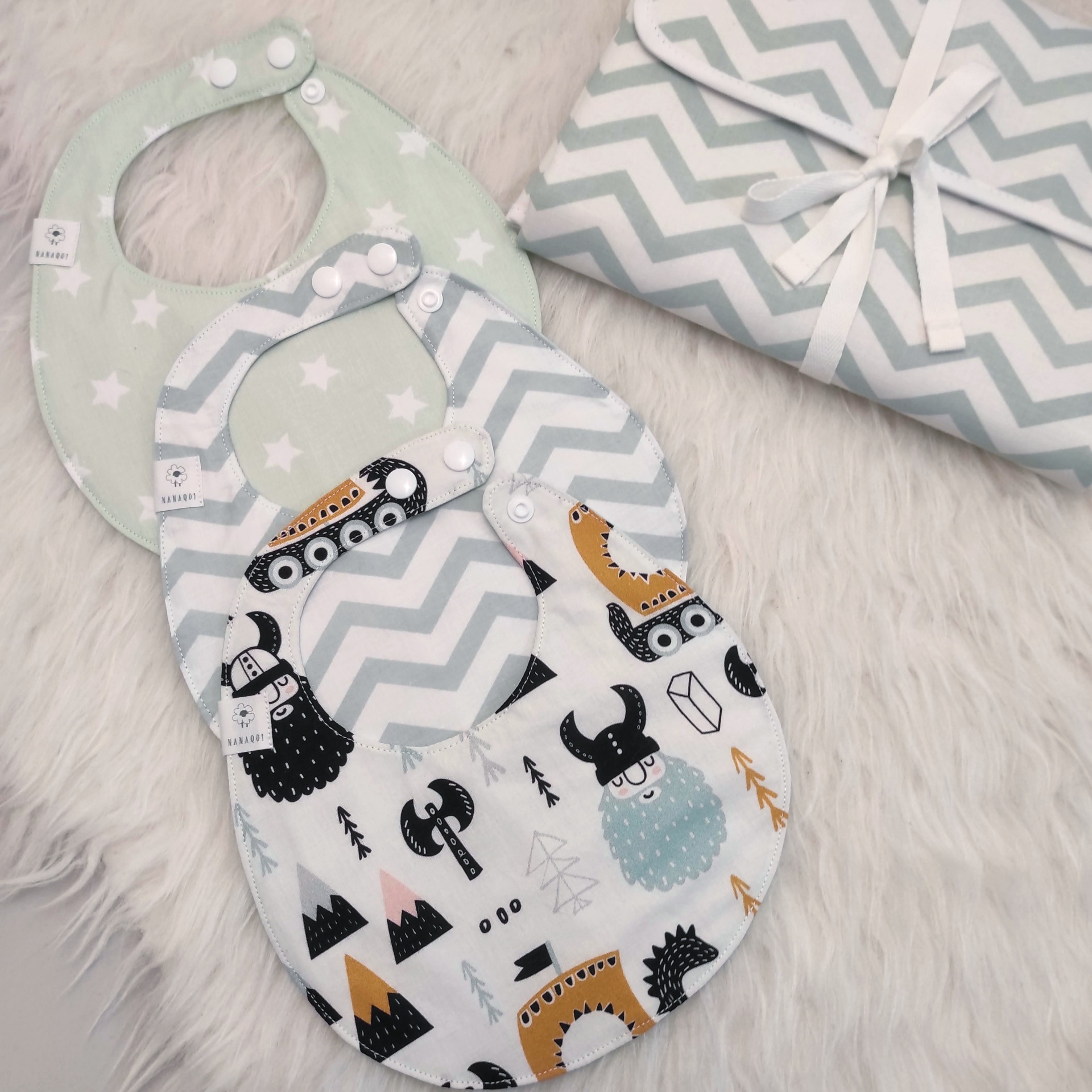 Três babetes para bebé com padrões diferentes sobre superfície peluda e capa dobrada com padrão de ziguezague