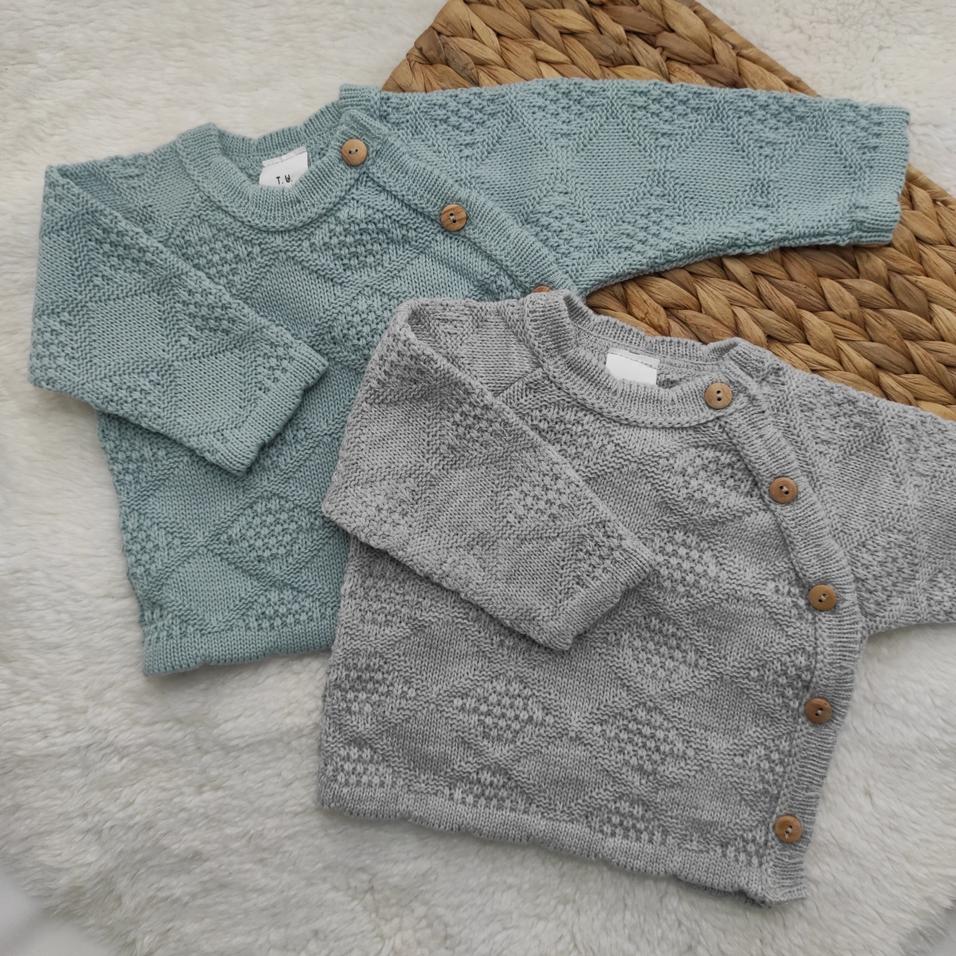 • Dois casacos de malha para bebés, verde-água e cinzento, com padrão em losango e botões de madeira