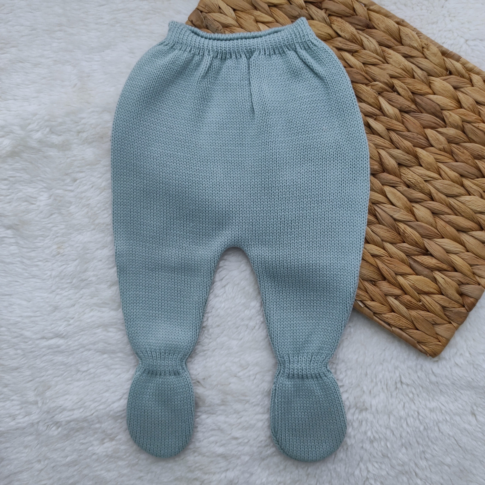 • Calças azuis claras de bebê em malha com pés fechados sobre superfície branca e esteira de fibras trançadas