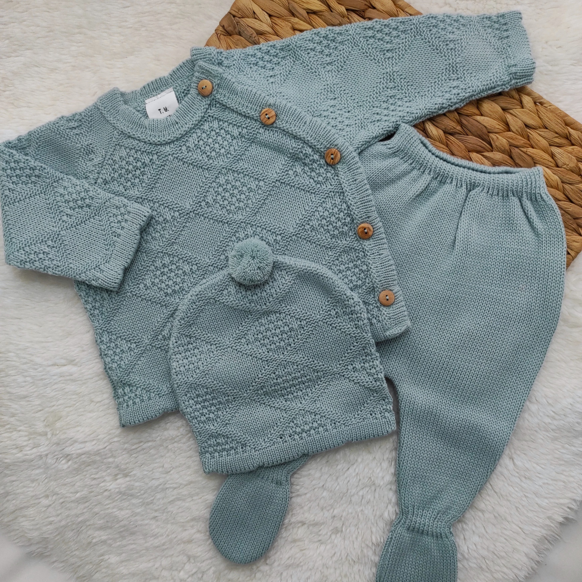 • Conjunto de roupa de bebé azul clara em malha com casaco, calças e gorro com pompom