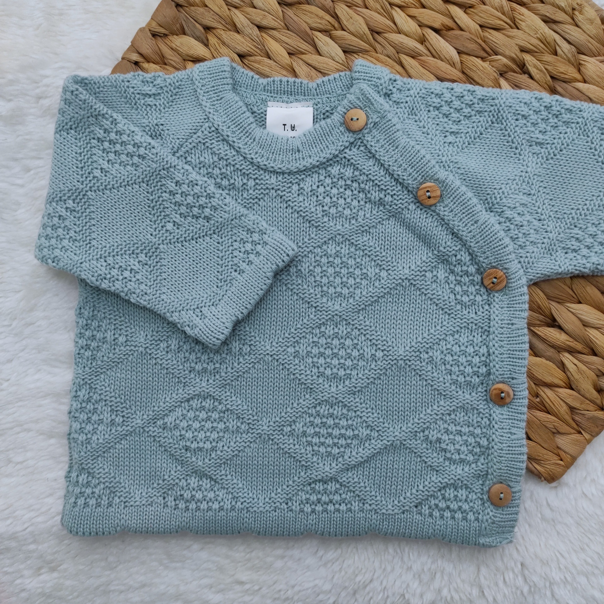 • Camisola azul claro de malha com botões de madeira e padrão em losangos.