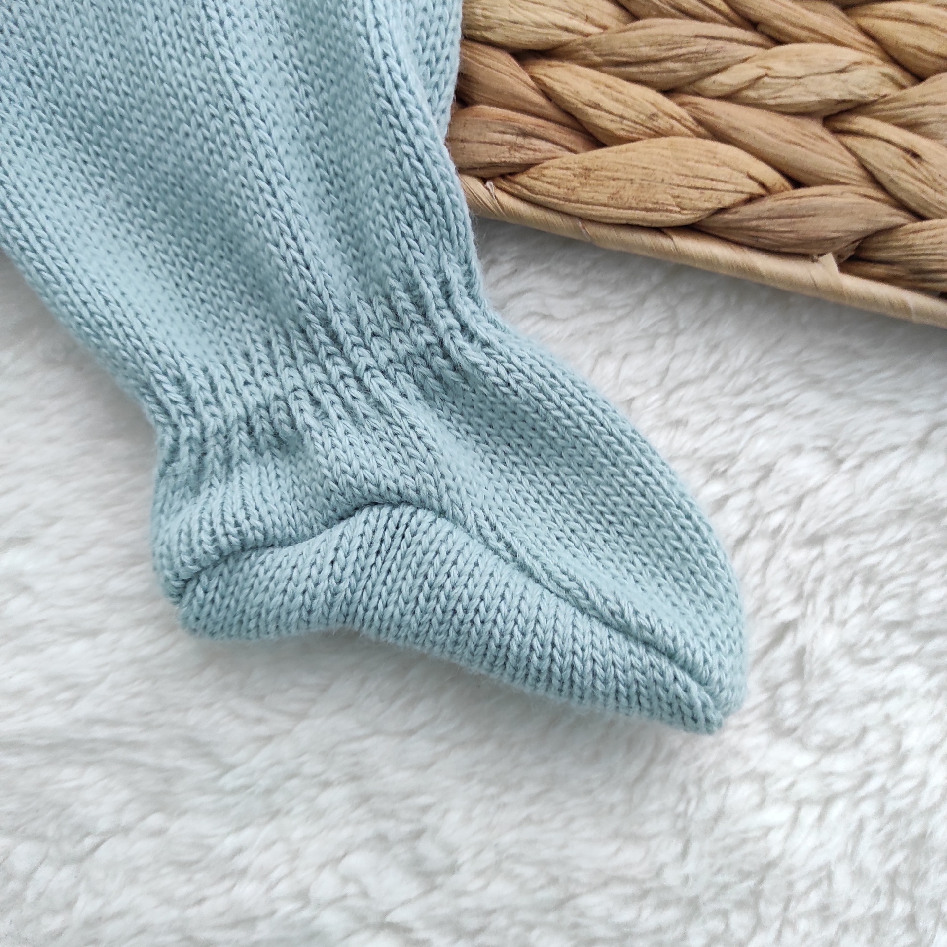 • Conjunto de roupa de bebé em malha azul clara com camisola, calças e gorro com pompom