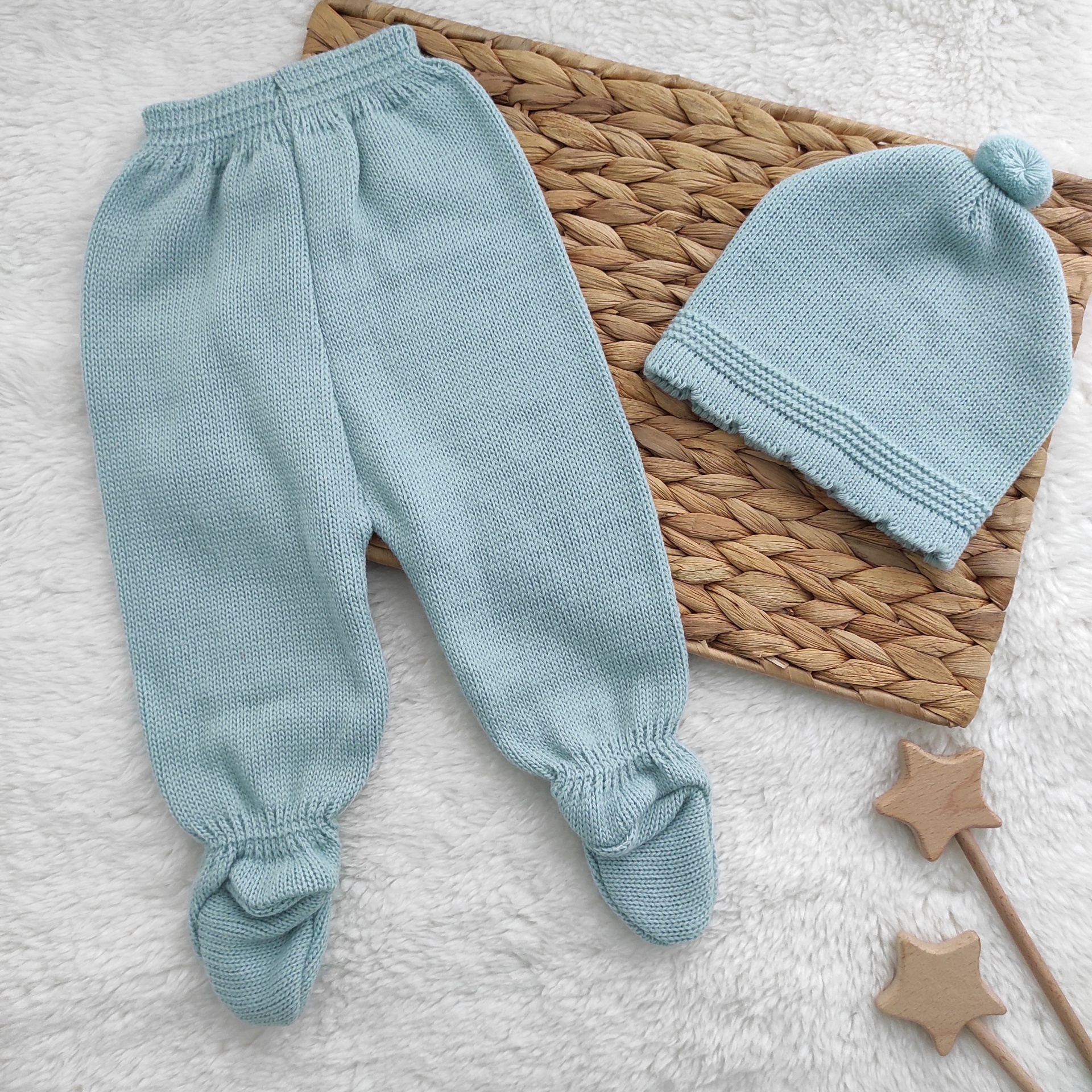• Conjunto de roupa para bebé azul claro de malha com calças e gorro com pompom