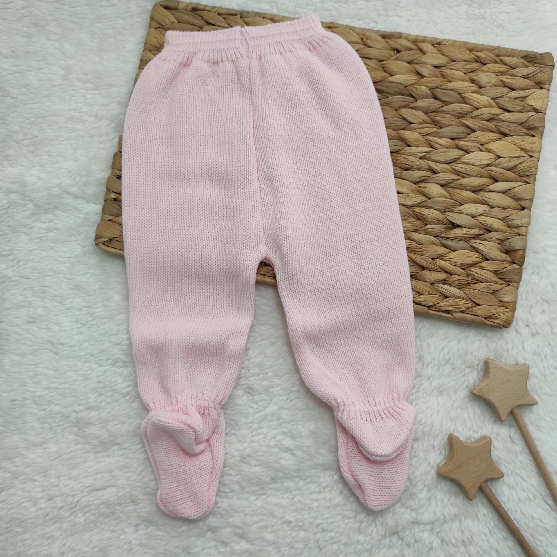 • Calças de bebé rosa com textura acolchoada e pezinhos fechados sobre tapete branco e base trançada