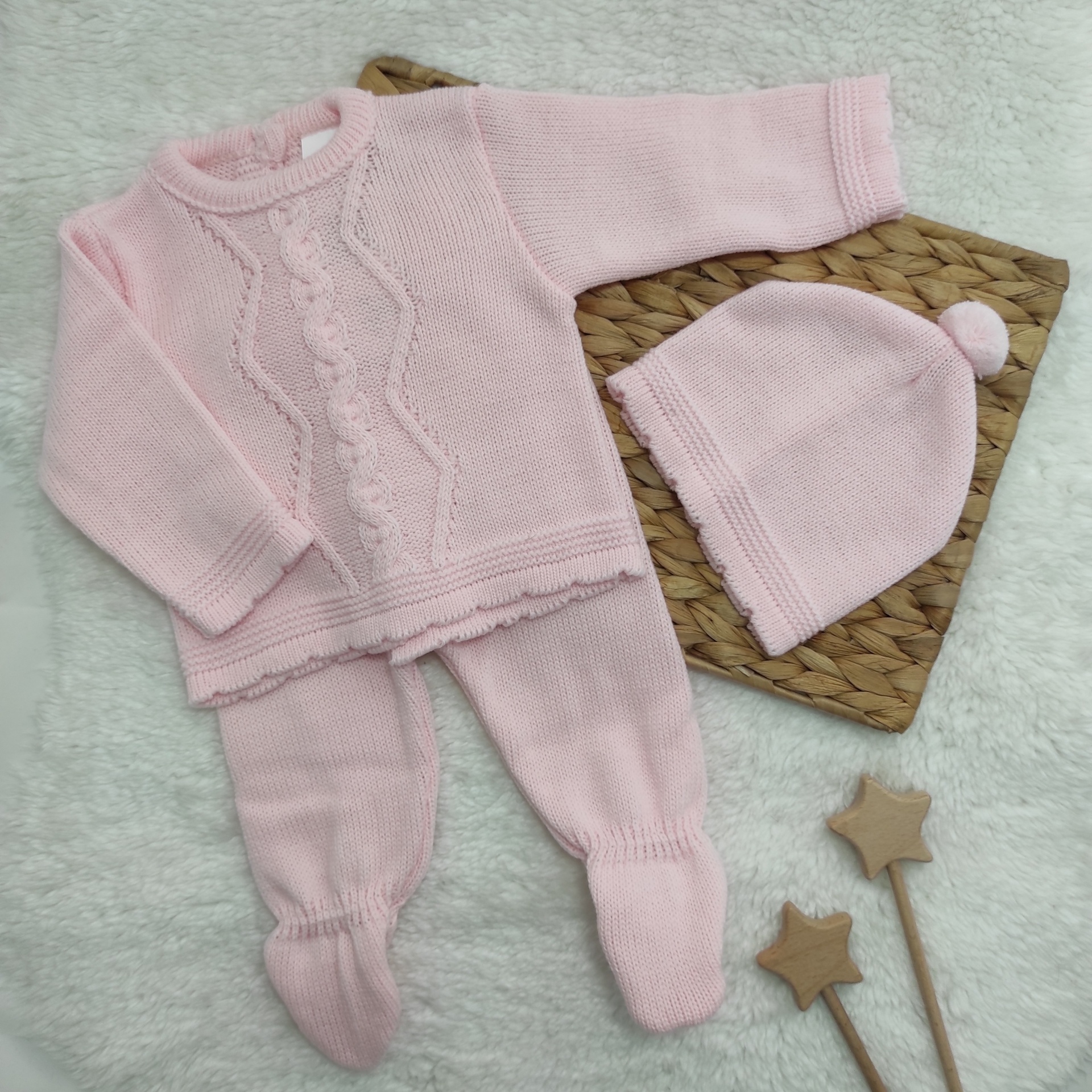 • Conjunto de roupa de bebé rosa em malha com camisola, calças e gorro com pompom