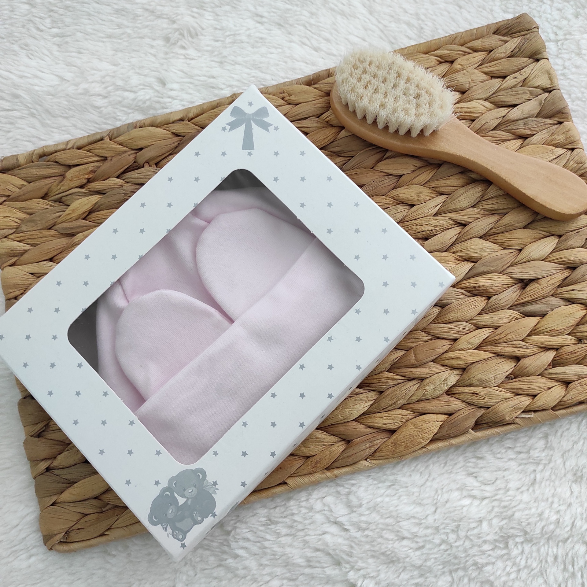 • Conjunto de bebé com gorro e luvas rosa em tecido macio sobre tapete de ráfia com escova de cabelo de madeira