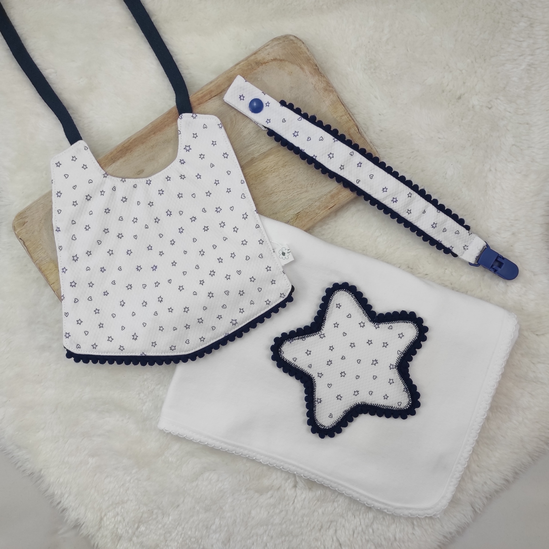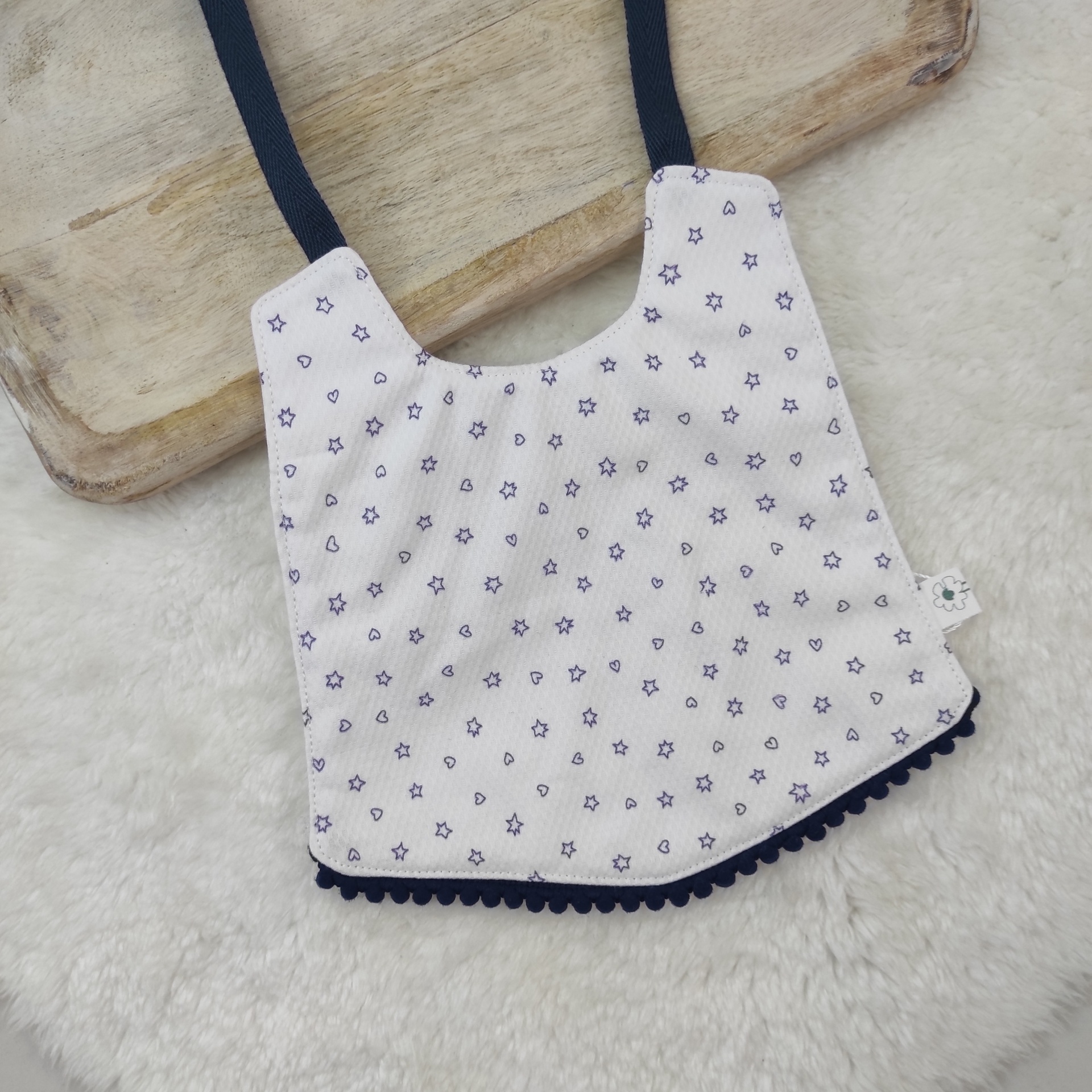 • Babete branco com estrelas azuis e tiras pretas sobre fundo de pelo branco e madeira clara