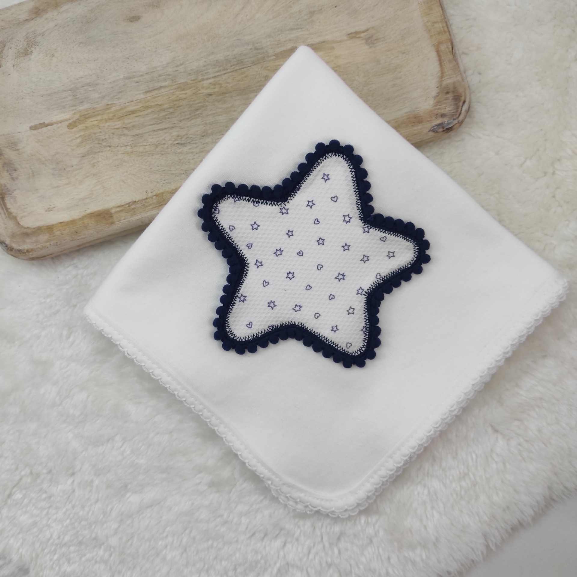 • Fralda branca de bebé com estrela bordada azul e branca