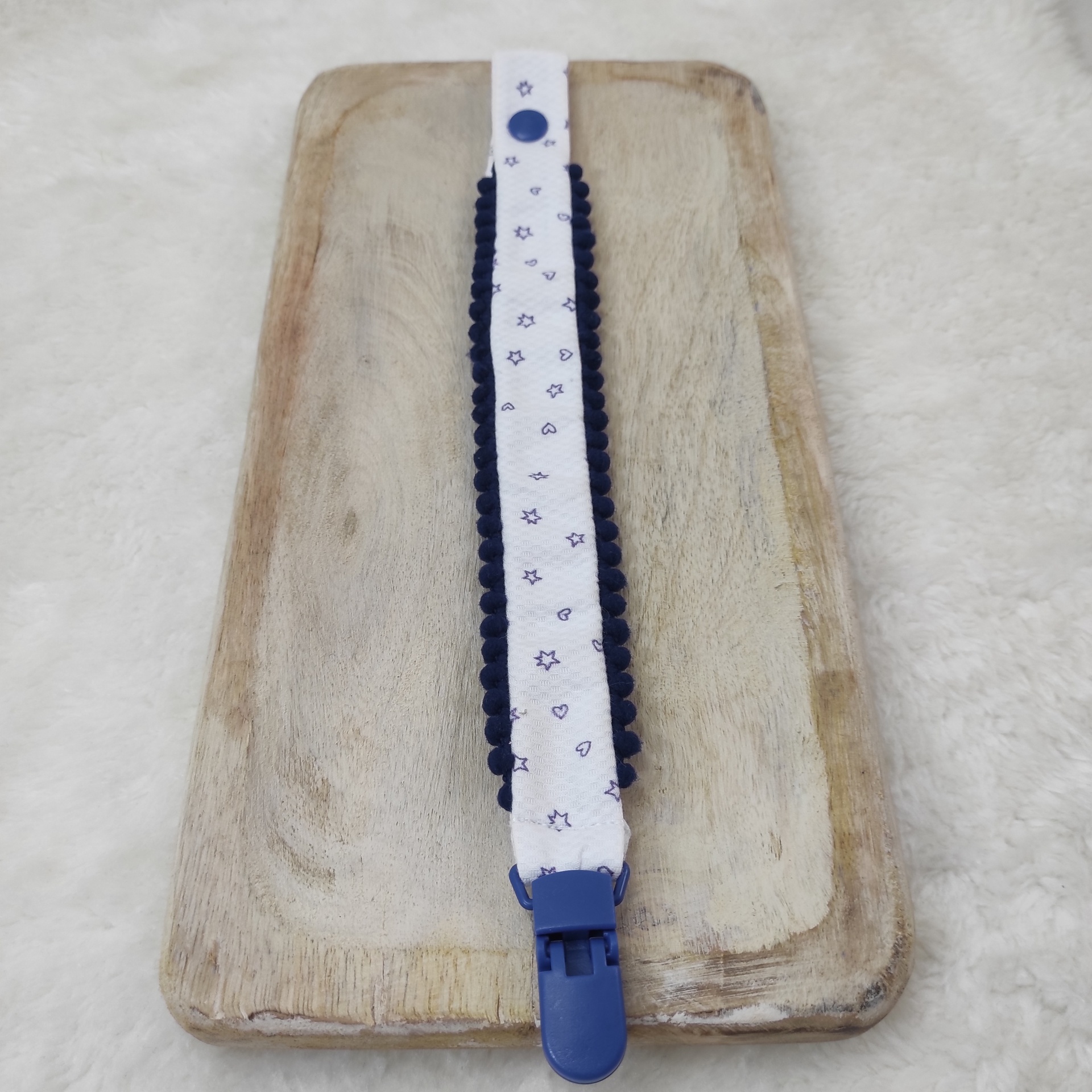 • Prendedor de chucha branco com estrelas e fecho azul sobre tábua de madeira.