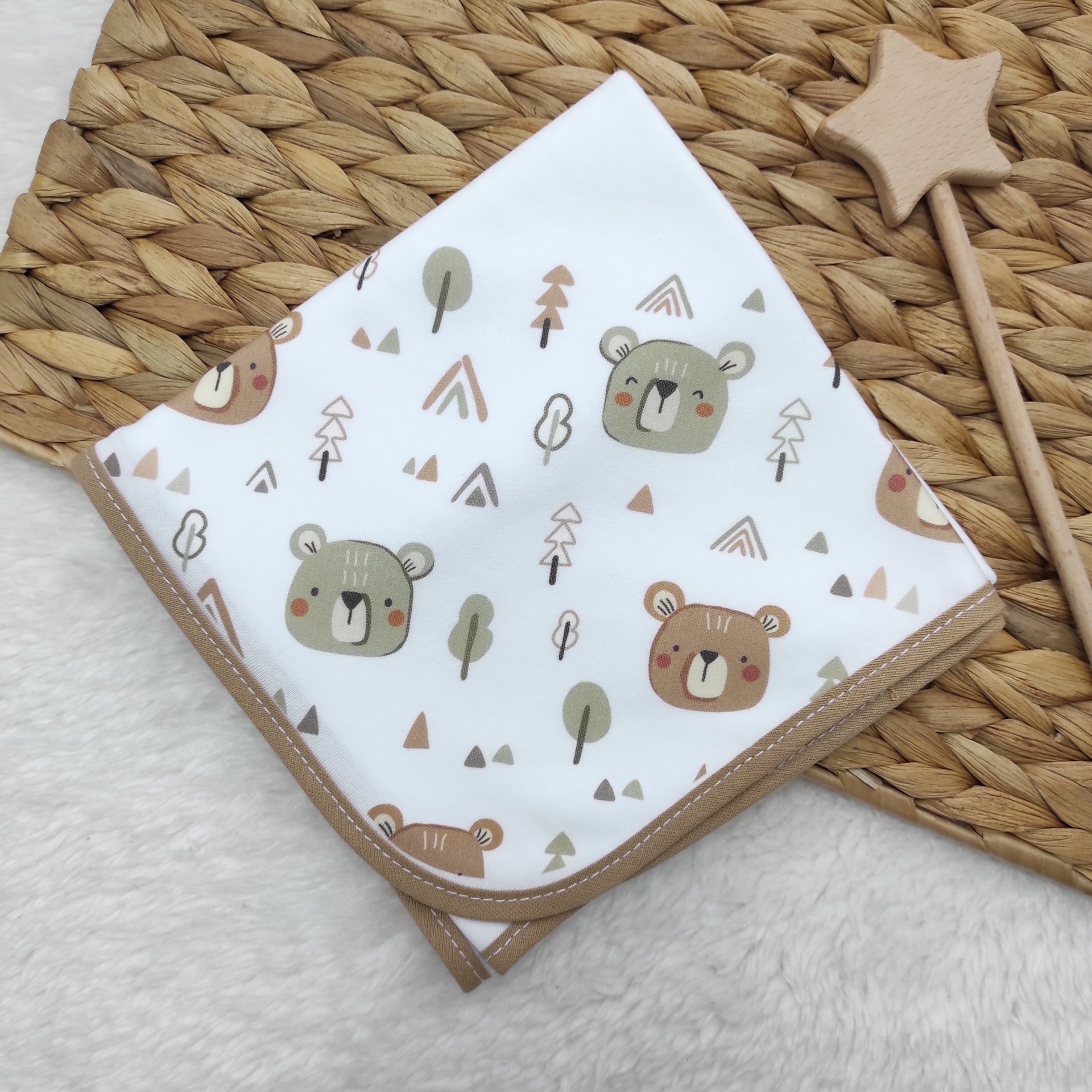 • Manta branca com padrão de ursos e árvores em tons terra, colocada sobre tapete de palha e tecido branco.