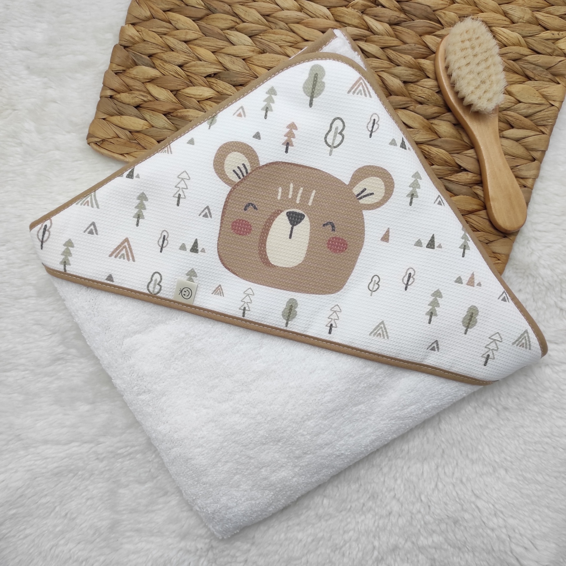 • Toalha de bebê branca com capuz decorado com urso castanho e árvores, e escova de madeira ao lado
