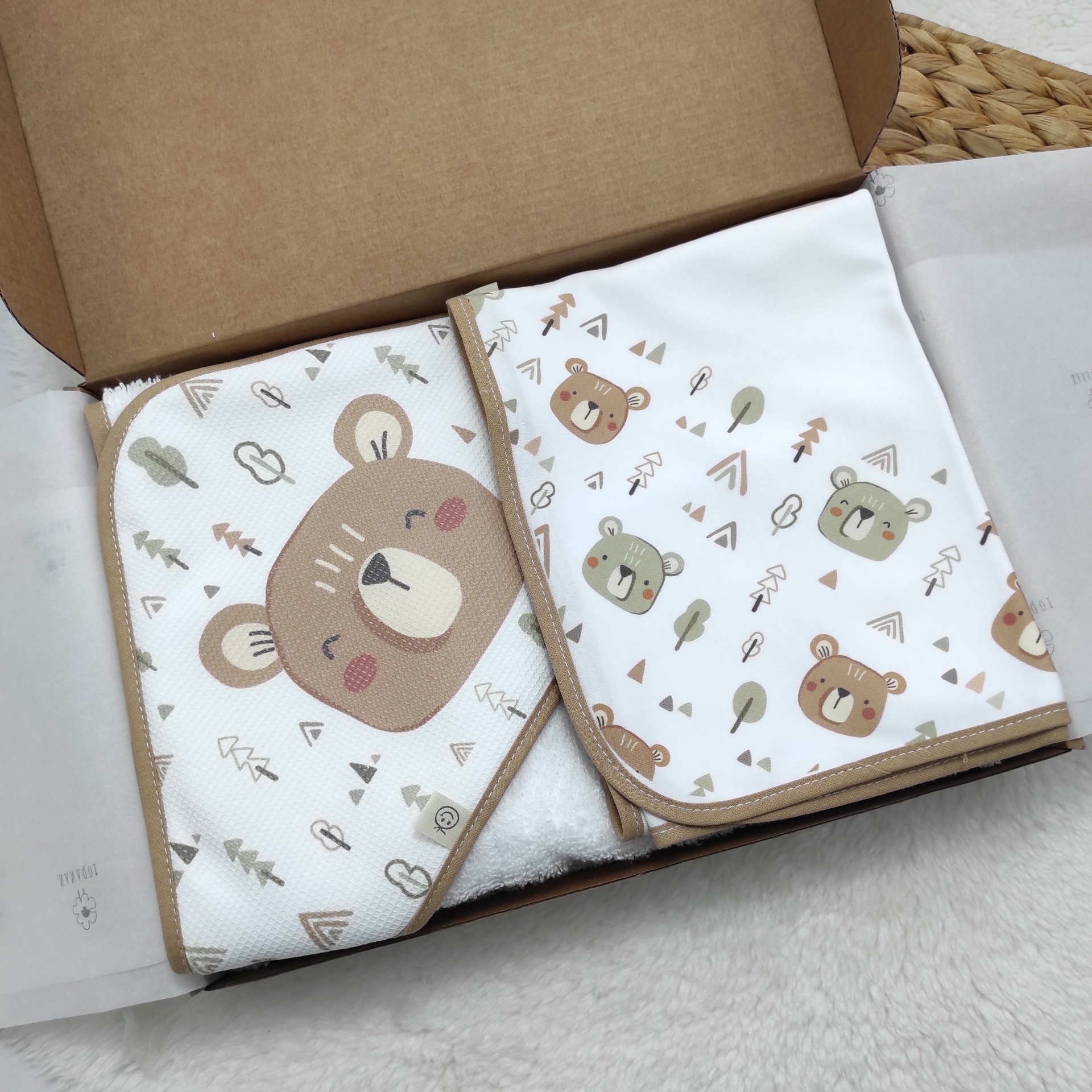 • Conjunto de dois mantas para bebé com estampado de ursos castanhos e verdes e detalhes geométricos, embalados numa caixa de cartão castanha.