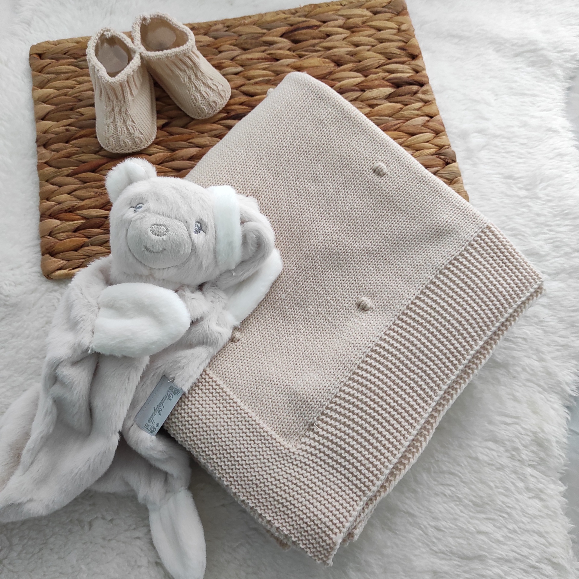 • Manta bege tricotada com ursinho de pelúcia e sapatinhos de malha