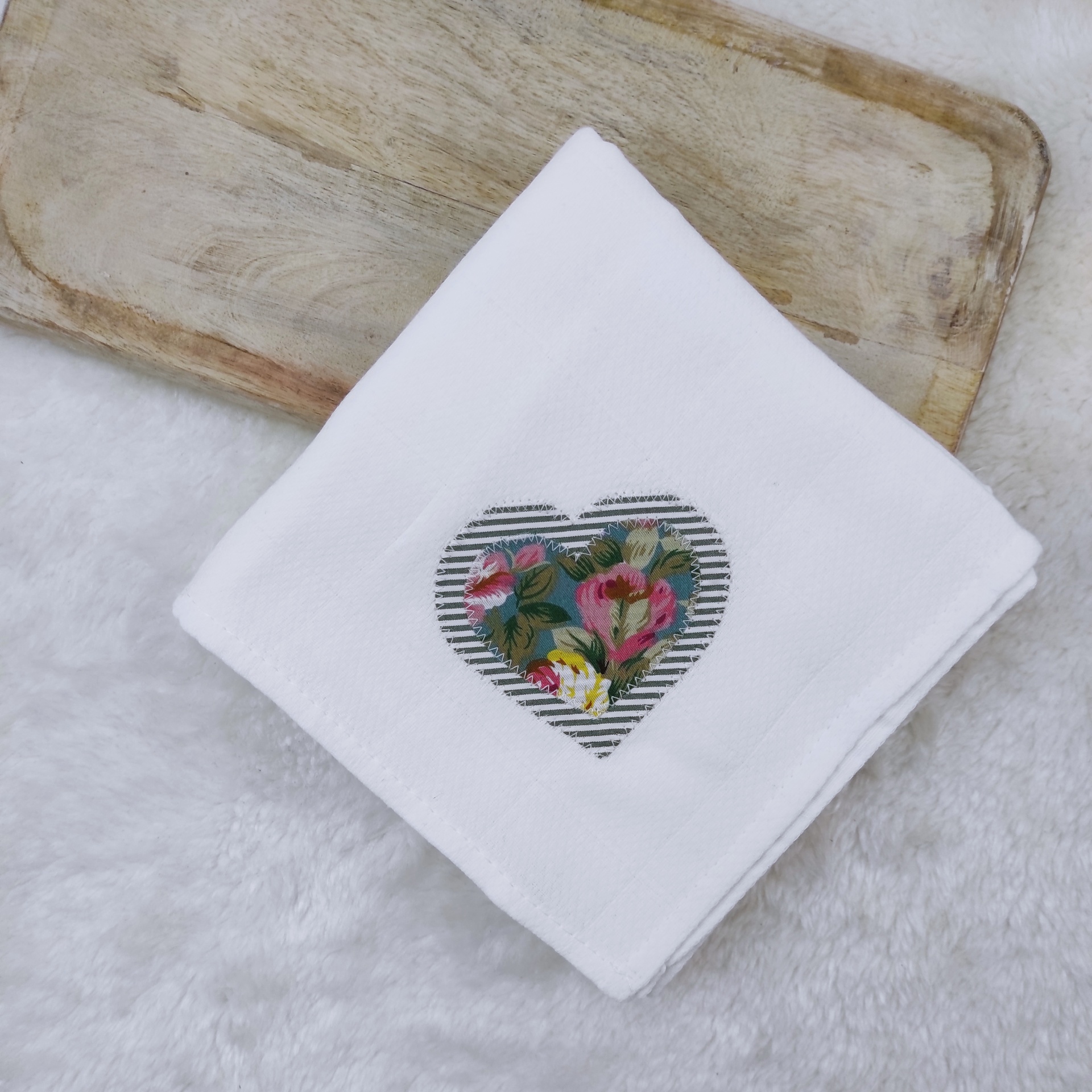 • Guardanapo branco com coração estampado floral sobre madeira