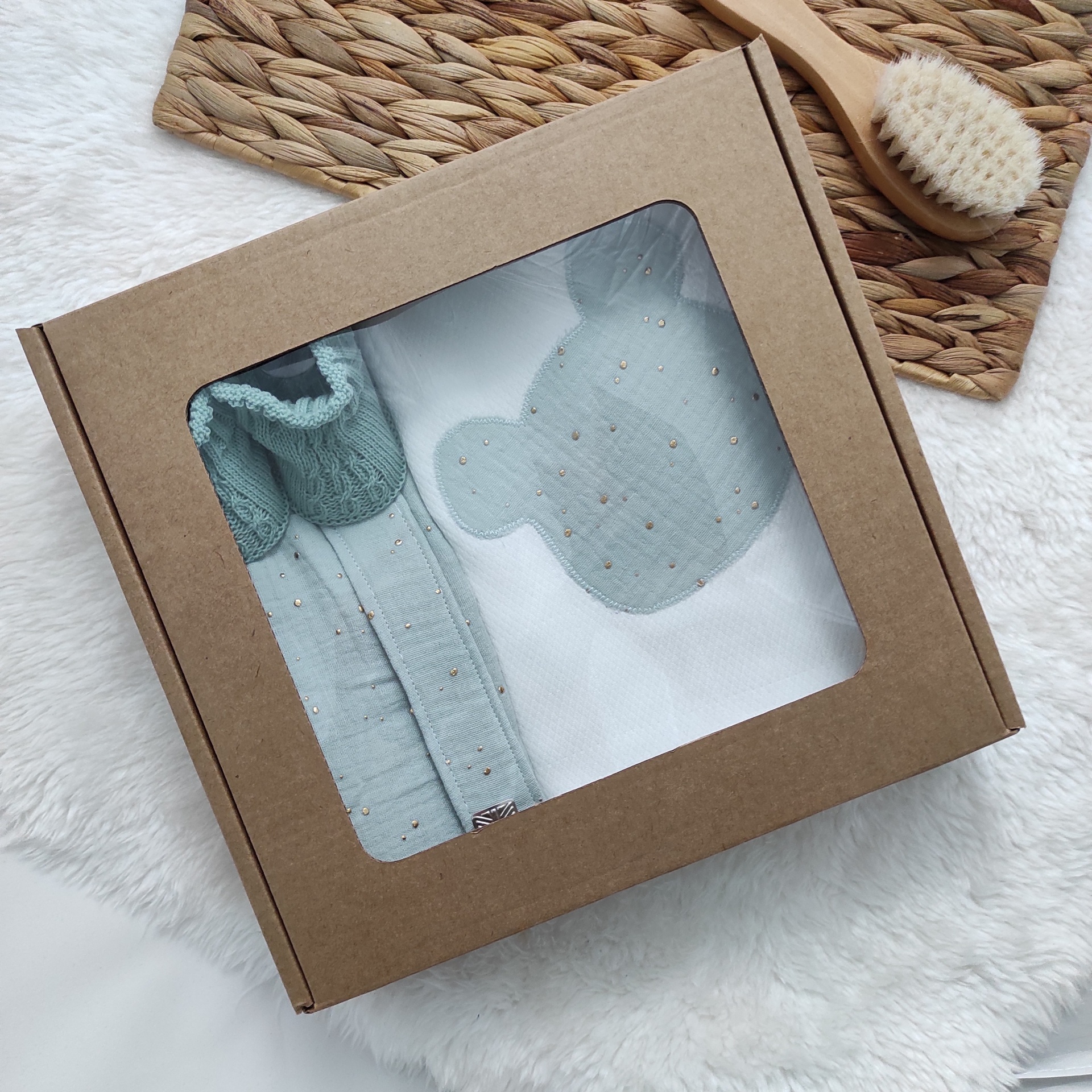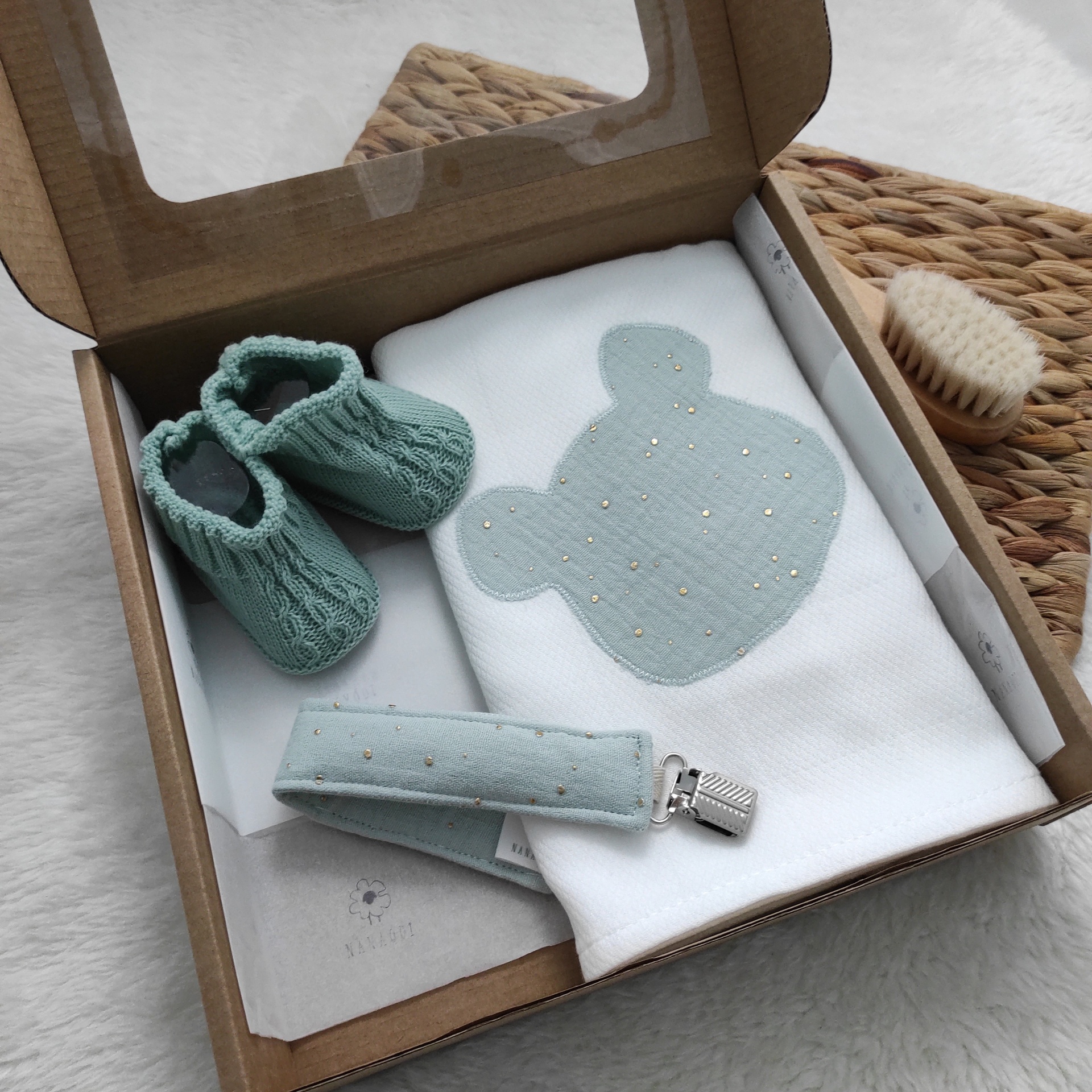 • Conjunto de bebé com manta, botinhas e prendedor de chucha azul claro numa caixa de cartão