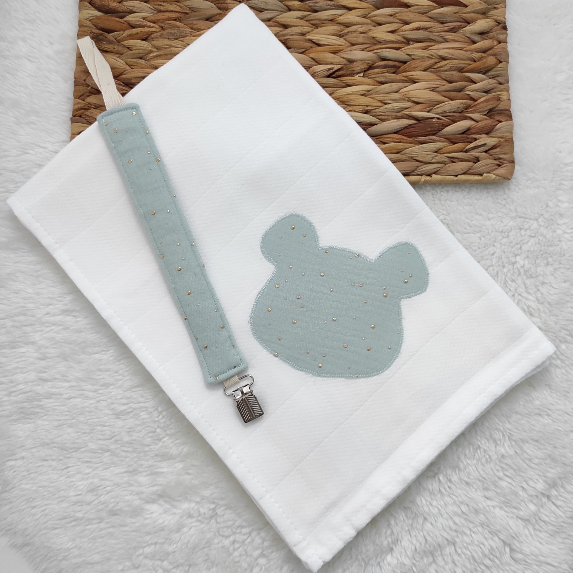 • Toalha branca com cabeça de urso azul claro e prendedor azul claro com clip