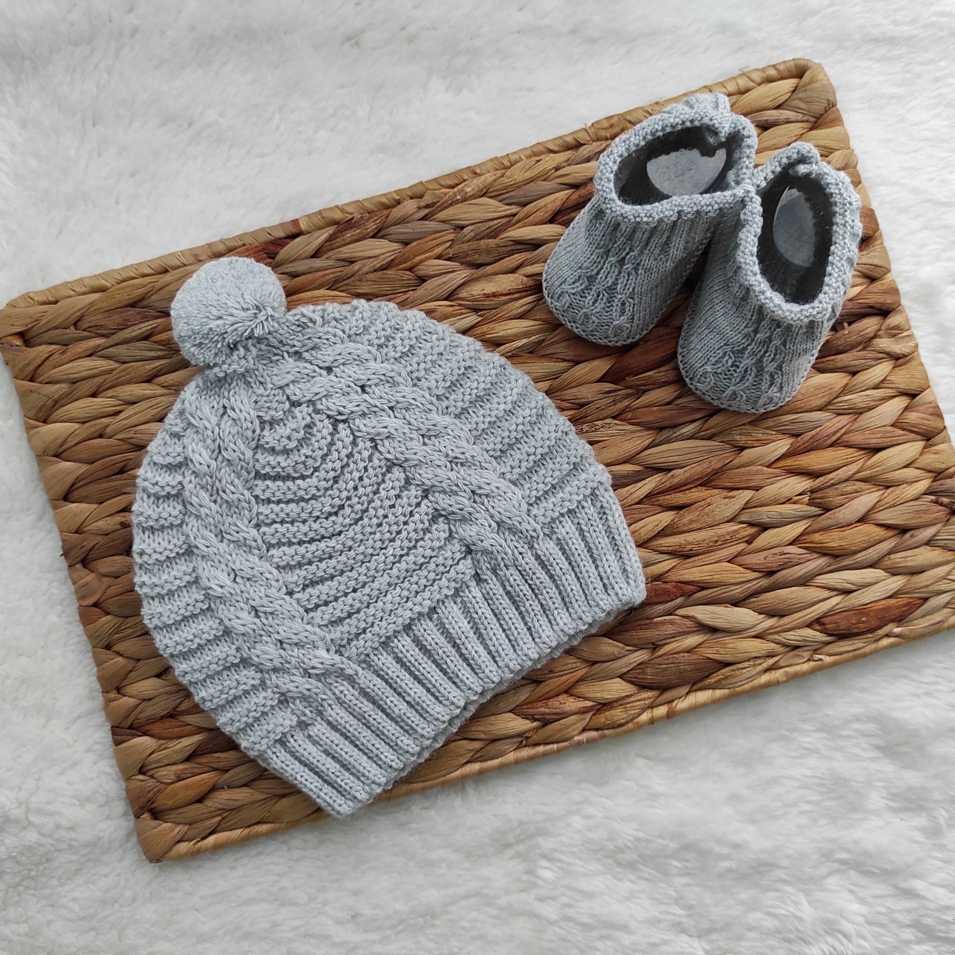 • Conjunto de gorro e sapatinhos de bebê cinza tricotados sobre tapete de palha