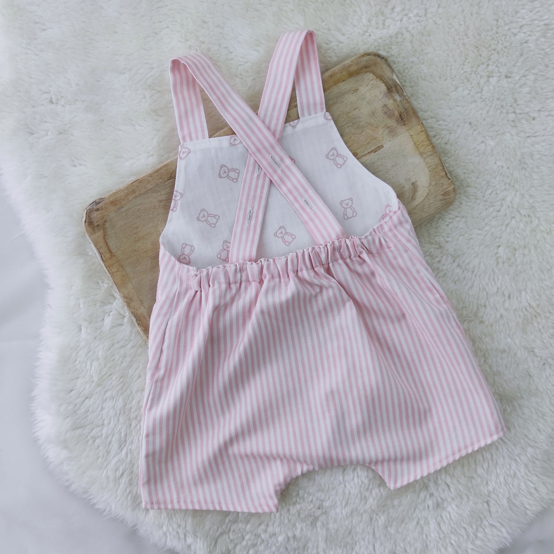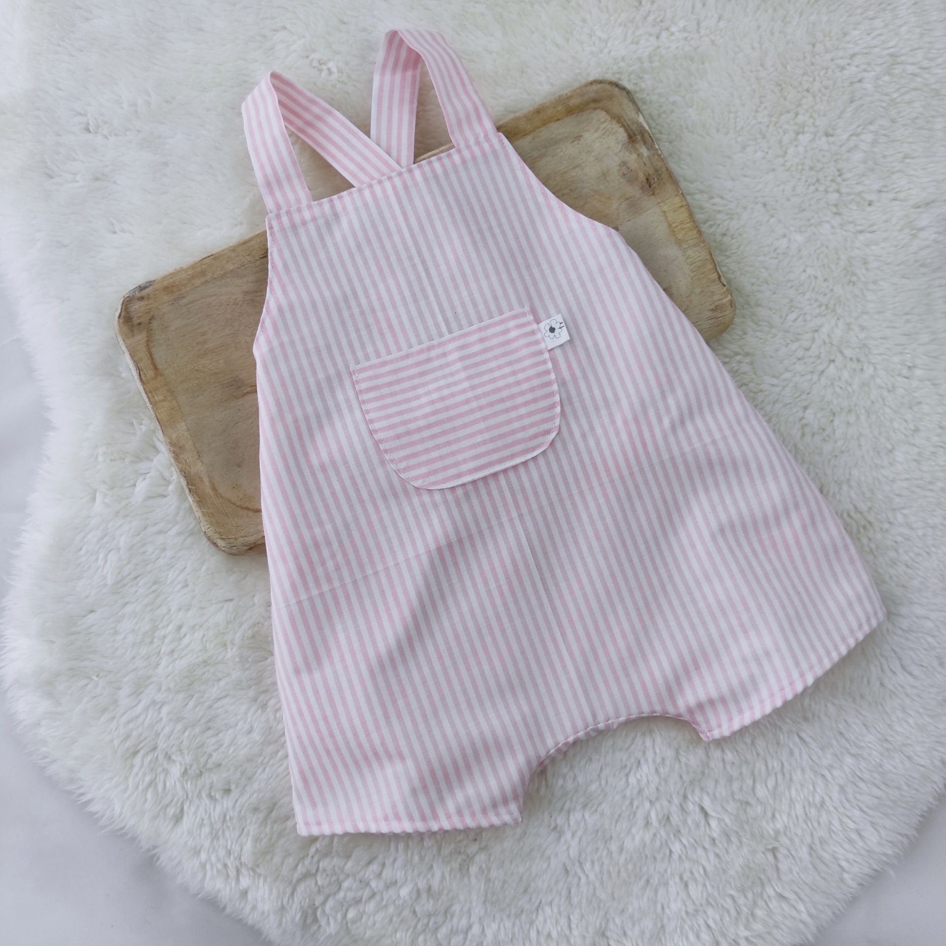 • Macacão de bebê rosa e branco com bolso frontal, sobre almofada branca felpuda