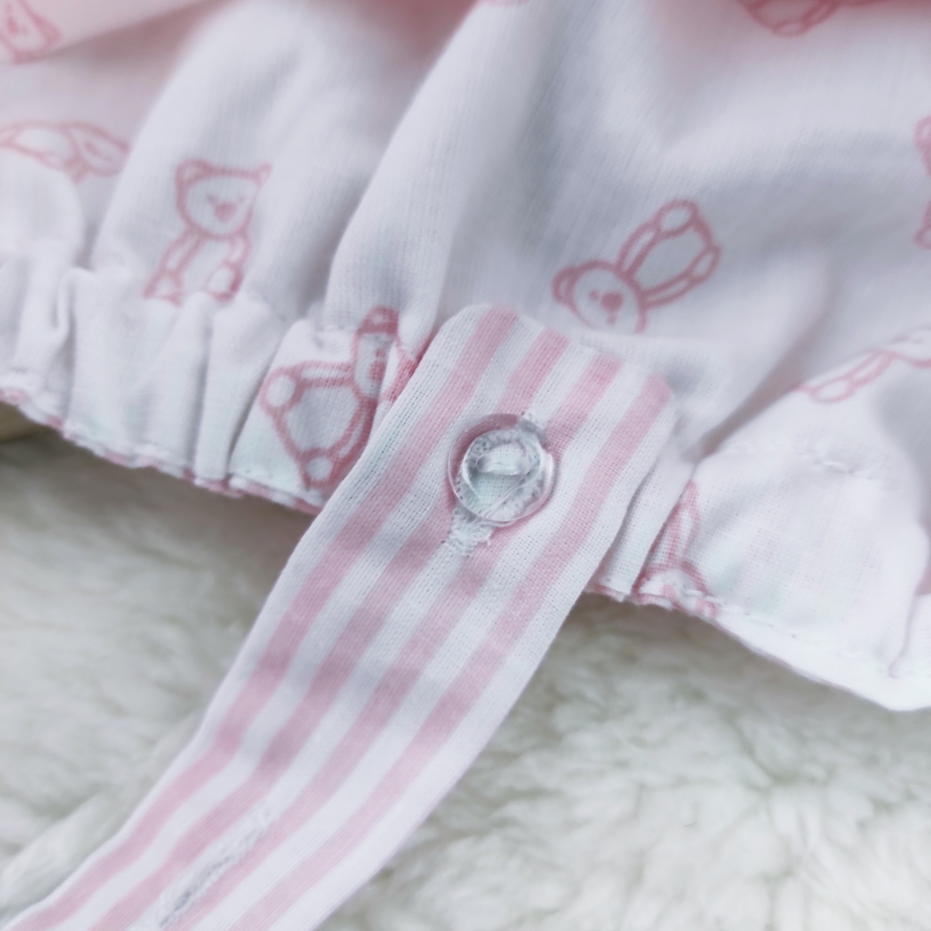 • Macacão de bebé rosa às riscas com ursinhos brancos sobre fundo de pele e madeira