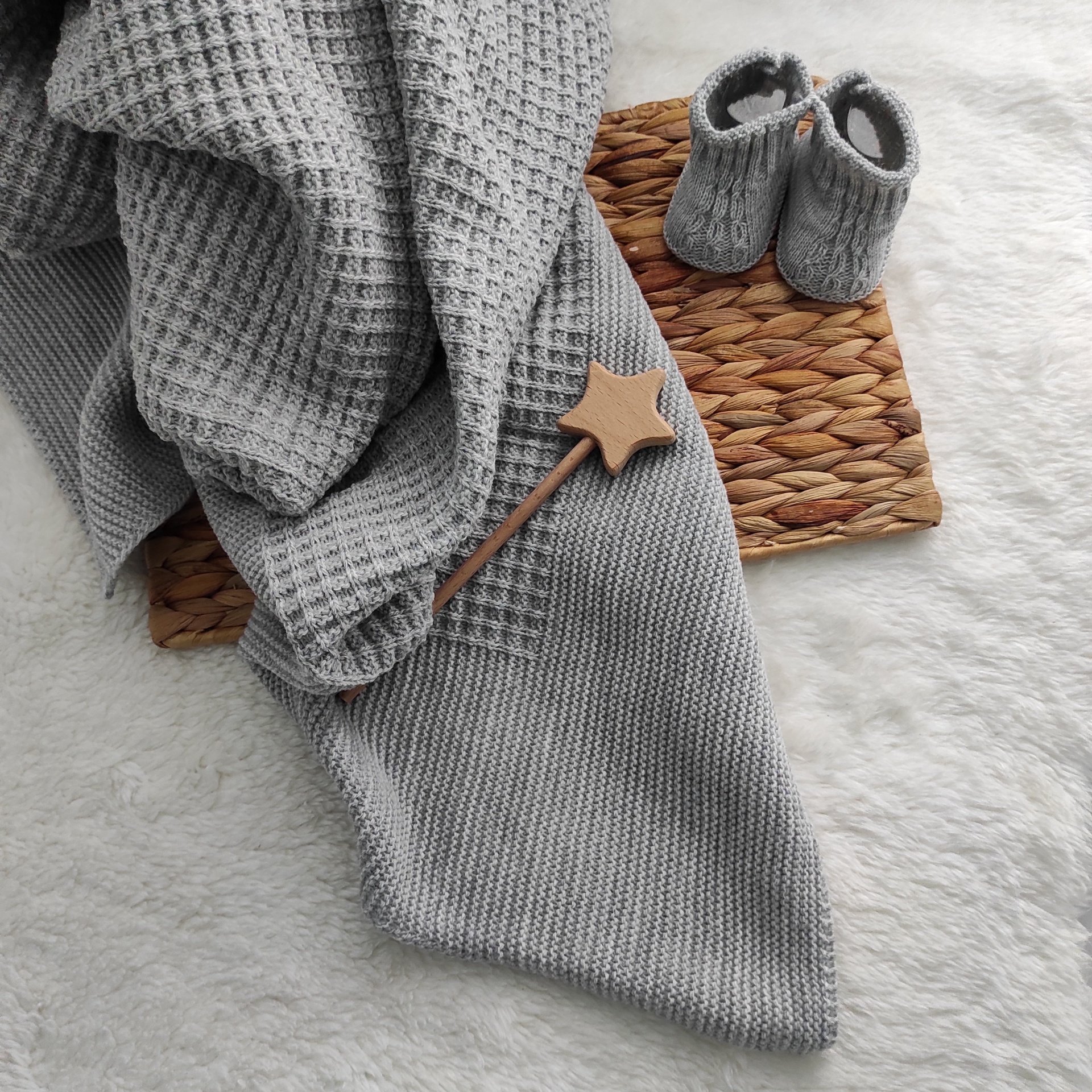 • Manta e sapatinhos de bebé cinza tricotados com varinha de estrela, sobre tapete e tecido branco.