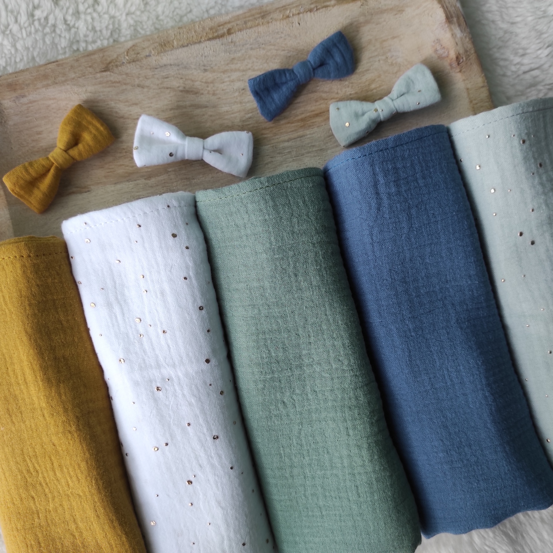 • Seis panos de tecido coloridos com laços correspondentes sobre tábua de madeira clara