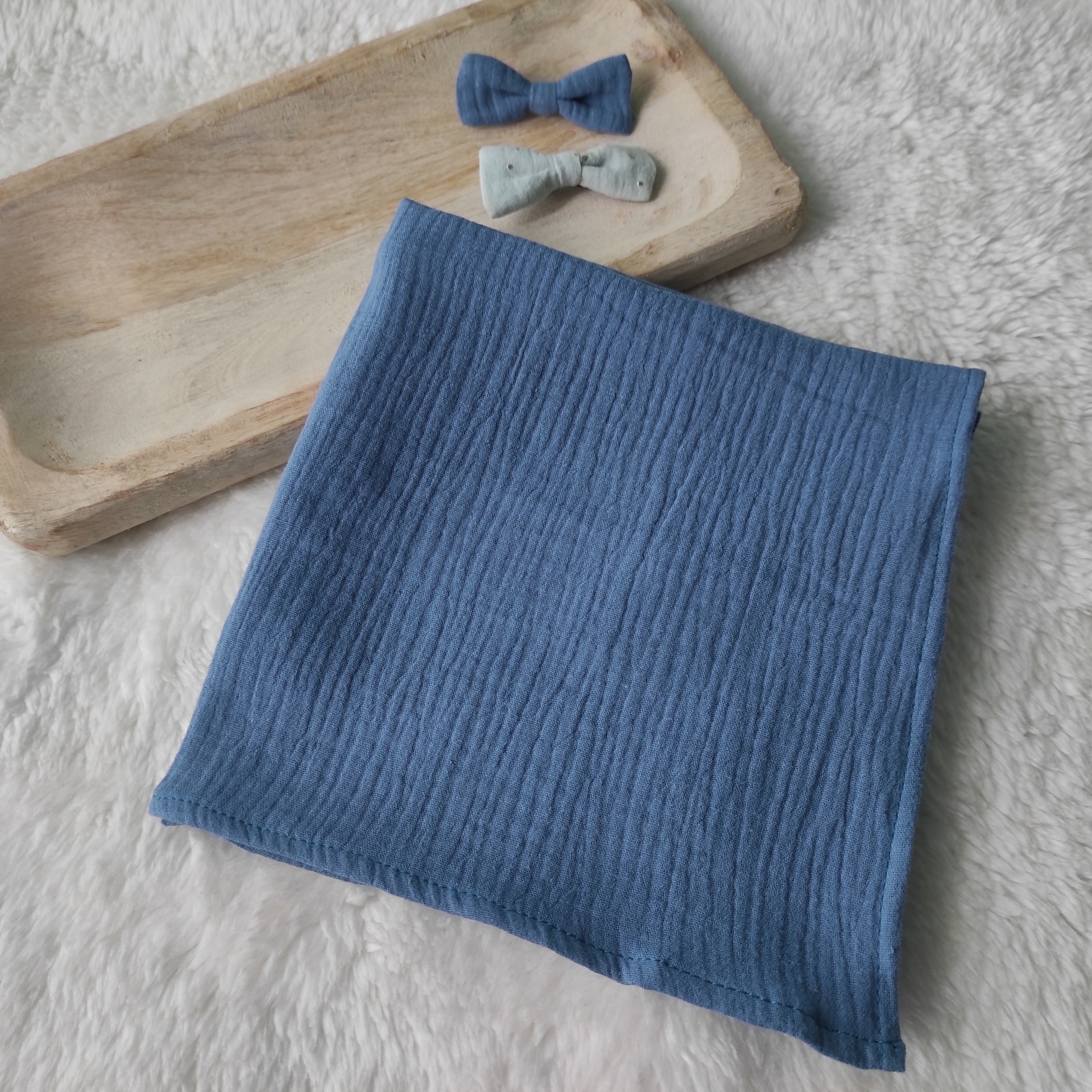 • Lenço azul com textura enrugada em superfície branca macia com duas gravatas borboleta sobre bandeja de madeira