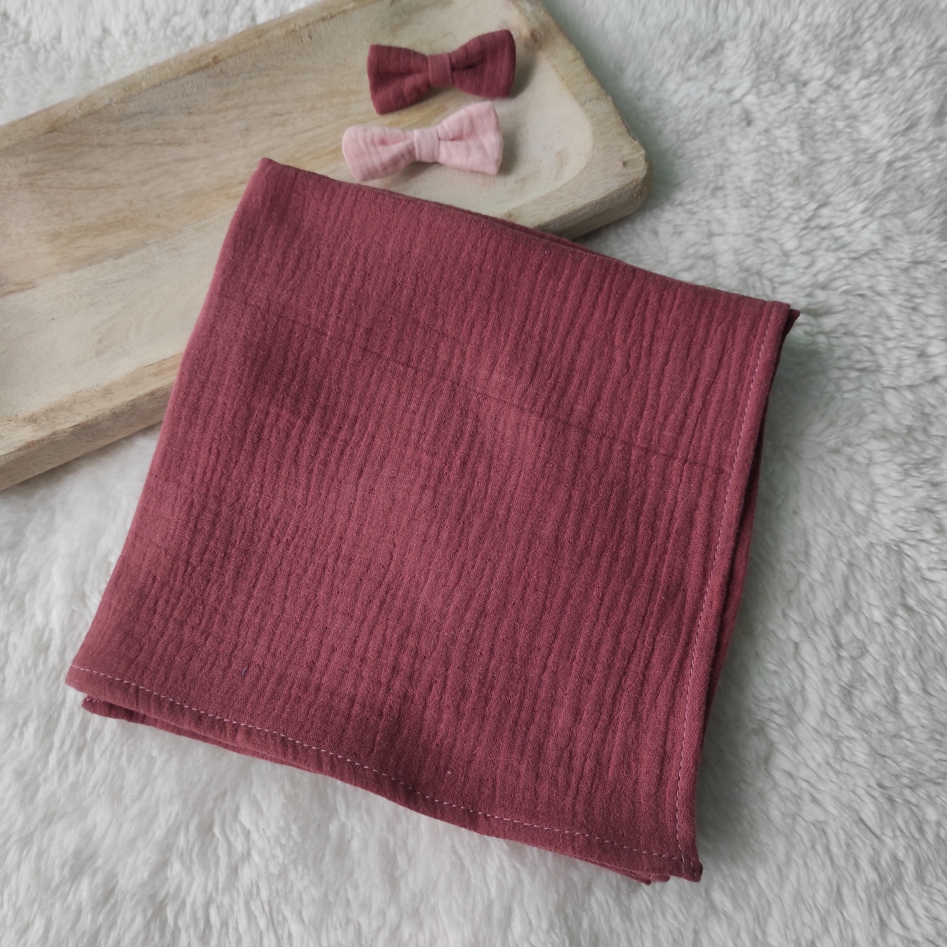 • Lenço vinho em tecido macio com dois laços pequenos sobre bandeja de madeira clara