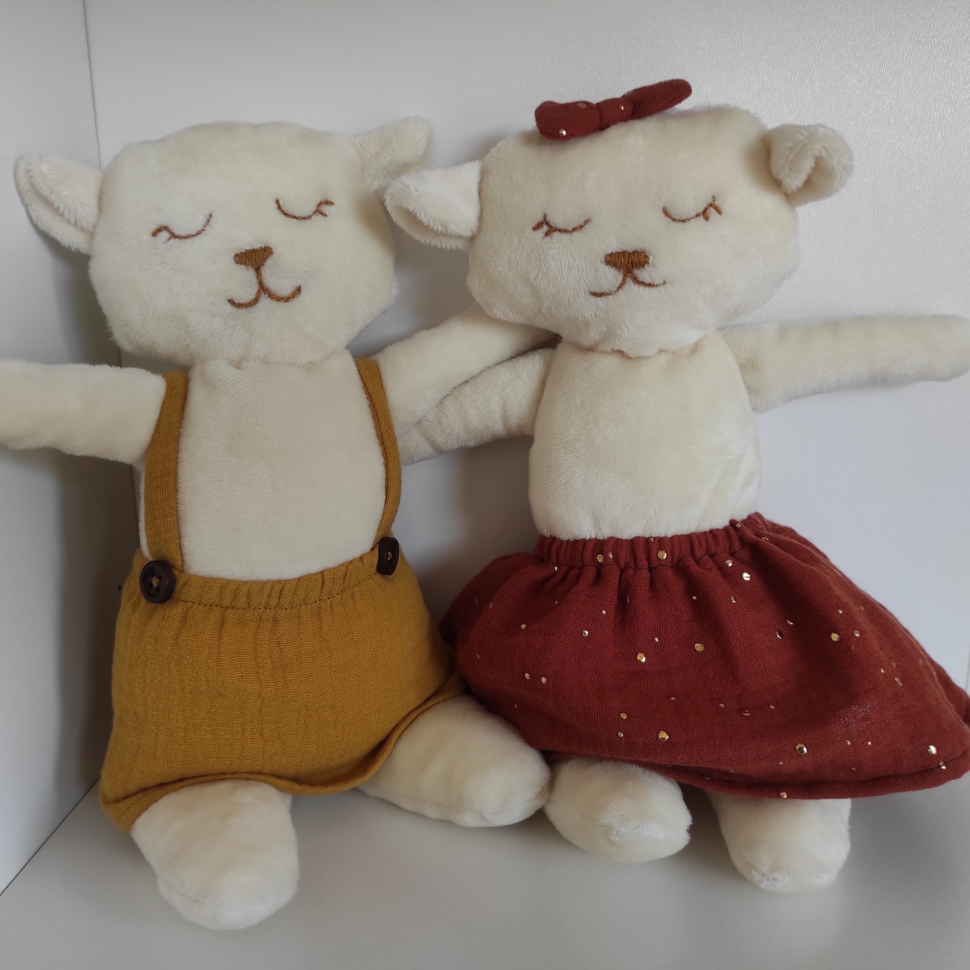 • Dois bonecos de peluche ovelhas com roupas coloridas juntos em fundo branco