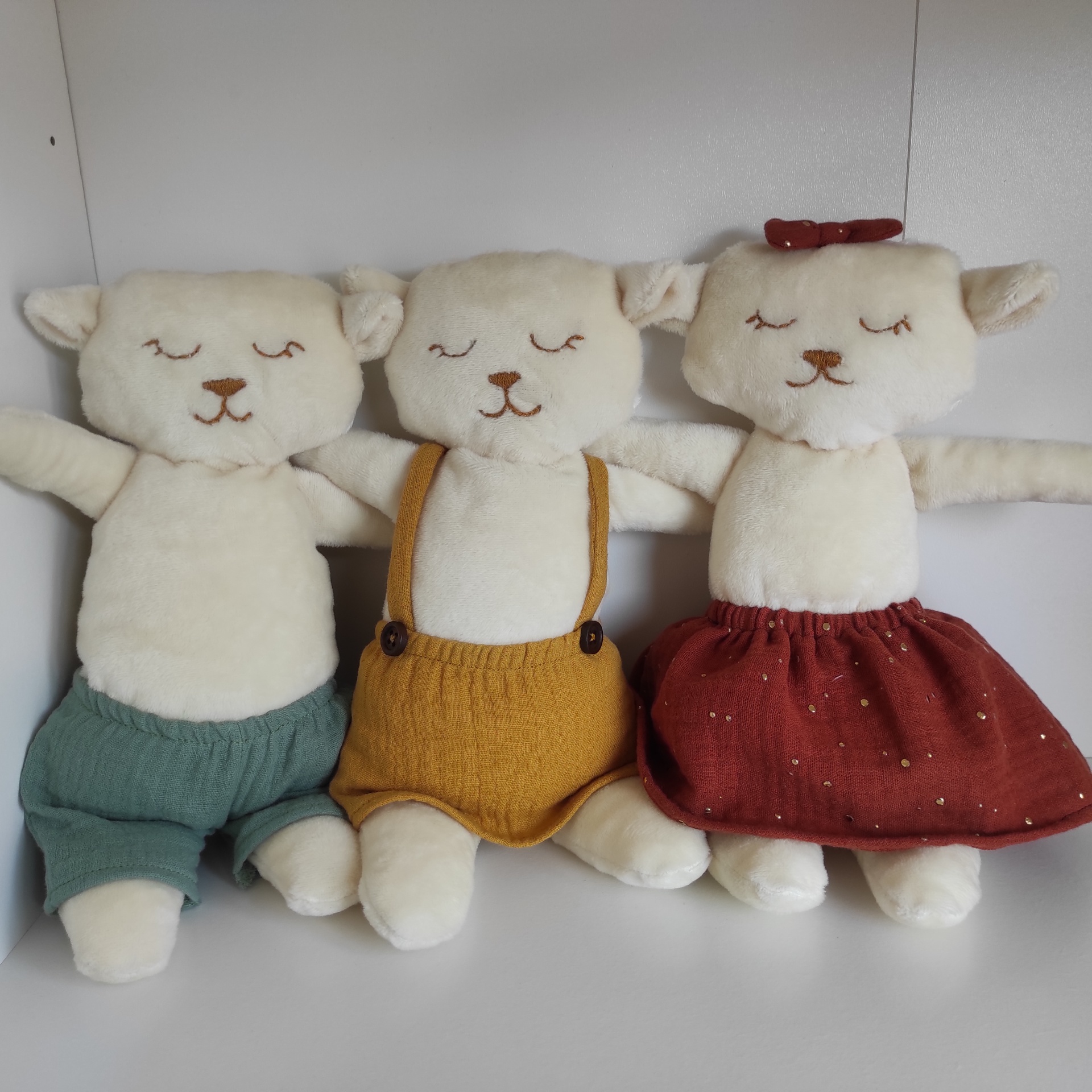 • Três ursinhos de peluche cor creme com roupas coloridas sentados lado a lado