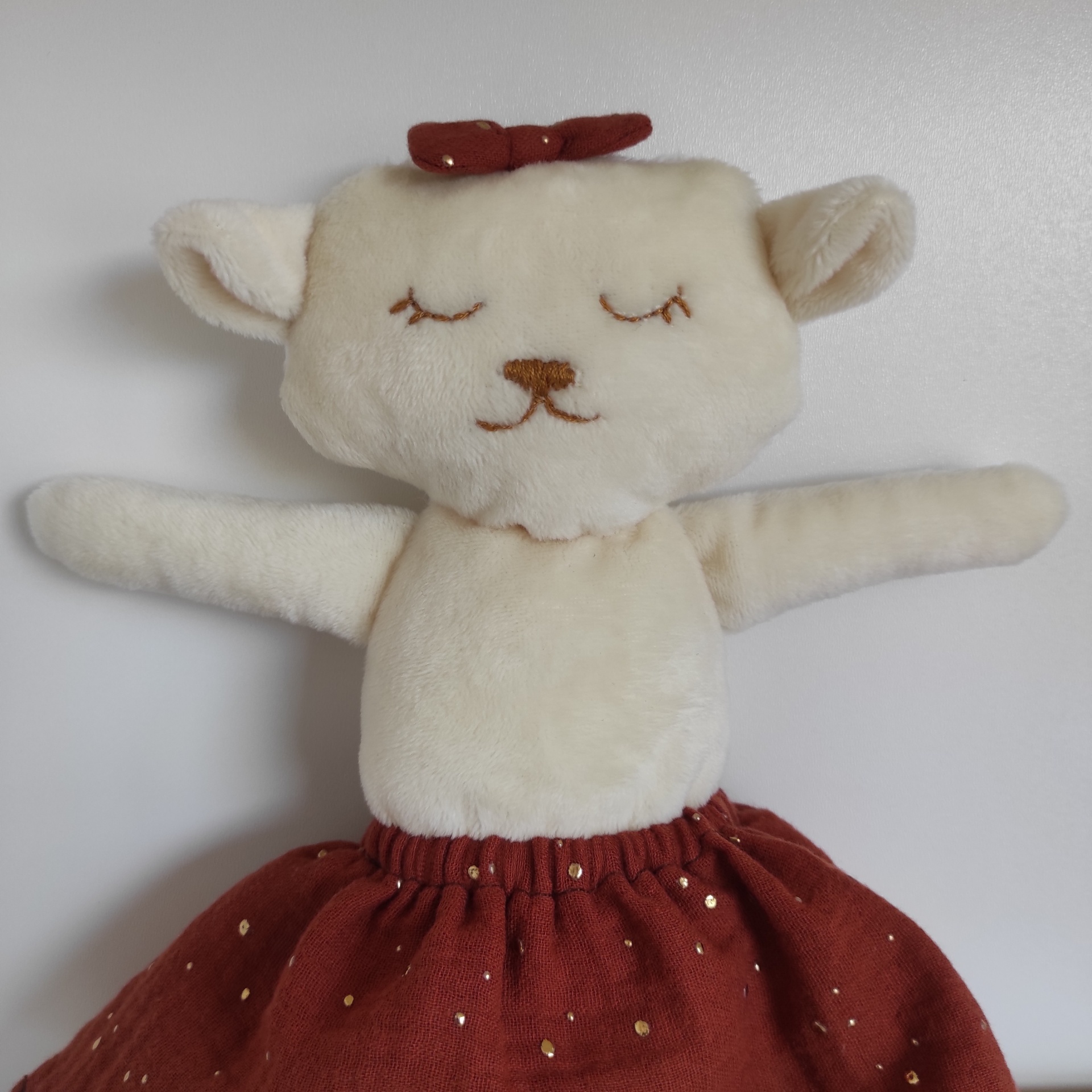 • Boneca de pelúcia creme com saia vermelha e fita na cabeça