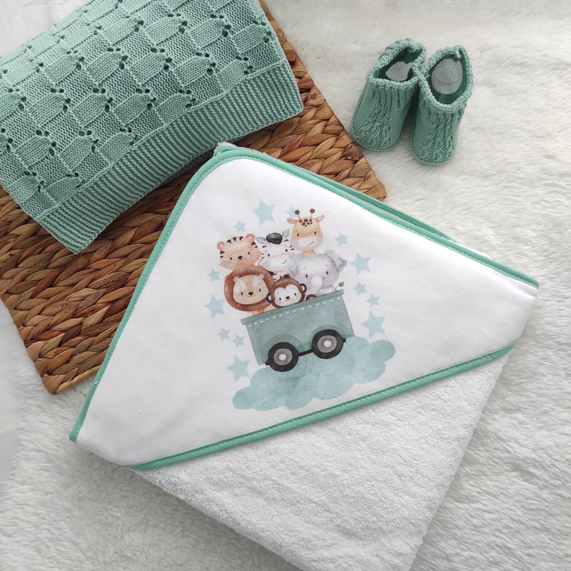• Fralda bebé com bordas verdes e desenho animais, mantinha e sapatinhos verdes tricotados